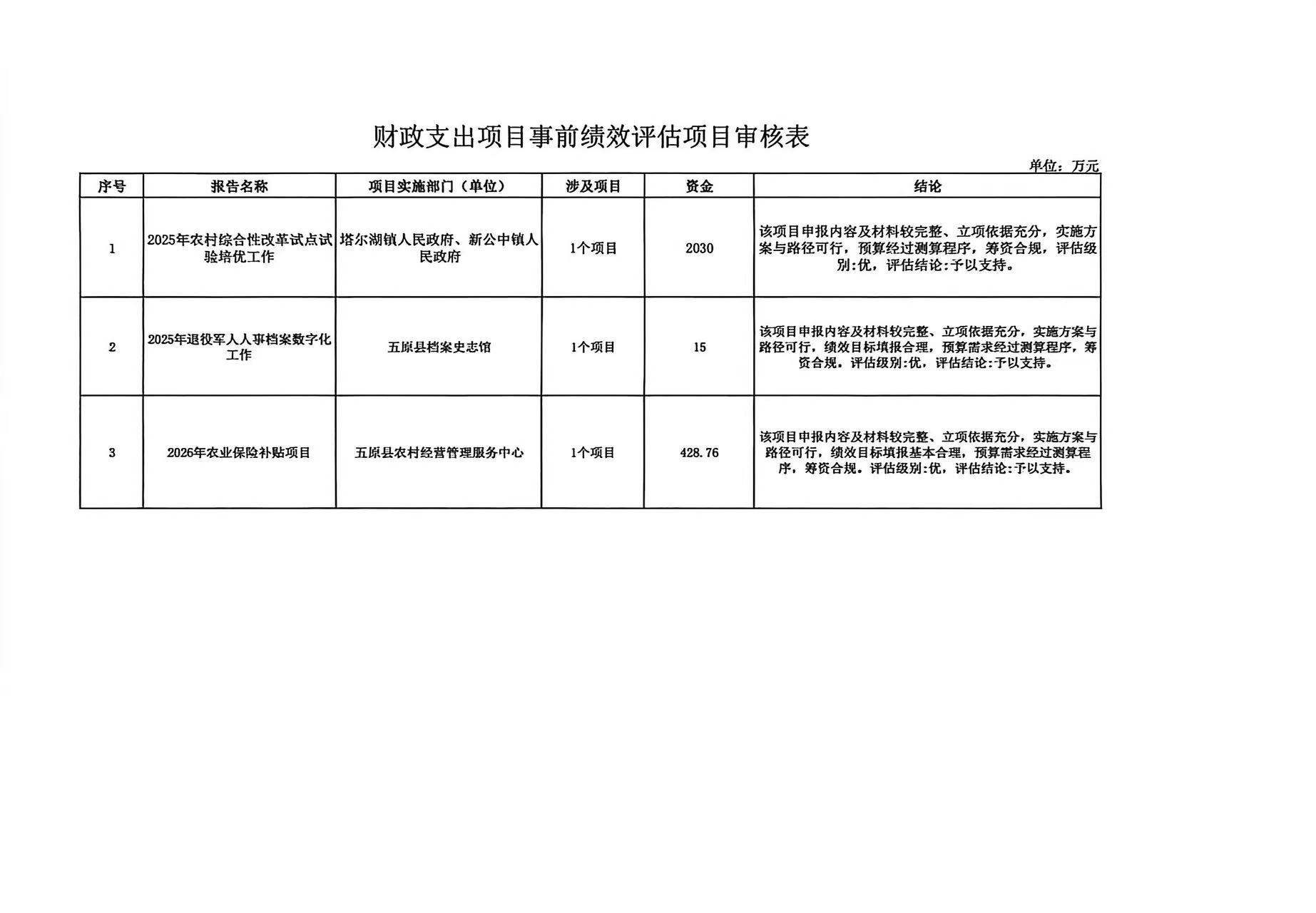 为深入贯彻落实《中共中央、国务院关于全面实施预算绩效管理的意见》(中发[2018]34号)和《内蒙古自治区关于全面实施预算绩效管理的实施意见》(内财监[2019]1343号)文件精神,根据《中华人民共和国预算法》、《项目支出绩效评价管理办法》(财预[2020]10号)、《内蒙古自治区项目支出绩效评价管理办法》(内政办发[2021]5号)等相关法规要求,2025年五原县财政局委托第三方中介机构对我县3个预算部门的财政支出项目进行了事前绩效评估。