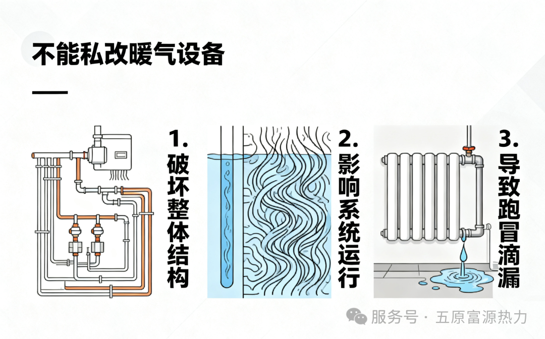 3、私装私改采暖设备,若缺乏必要的施工设施和经验,会出现暖气管道不严密的跑冒滴漏等现象,影响采暖效果。