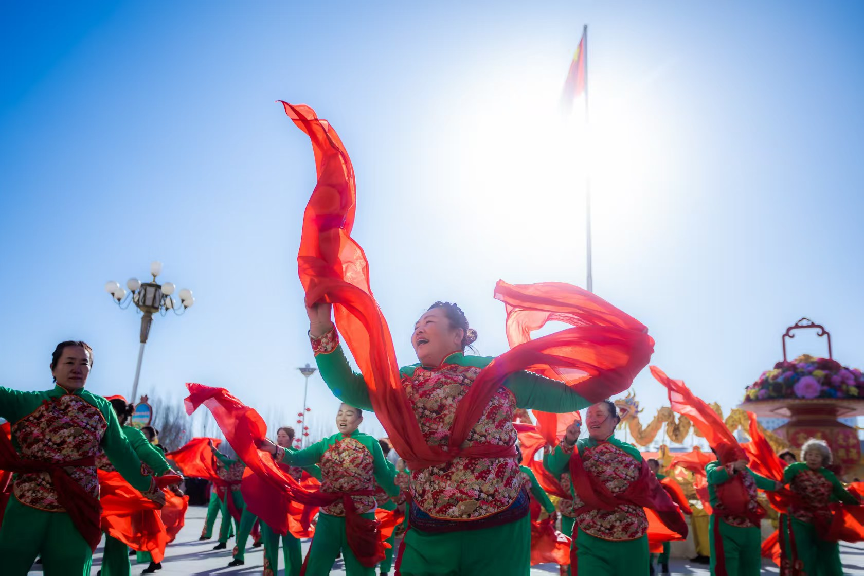 由各乡镇组织的社火展演将现场氛围推向高潮。旱船竹马、腰鼓高跷轮番上场,演员们身着华服,以精湛的技艺和饱满的热情,演绎出质朴乐观的民俗风情。