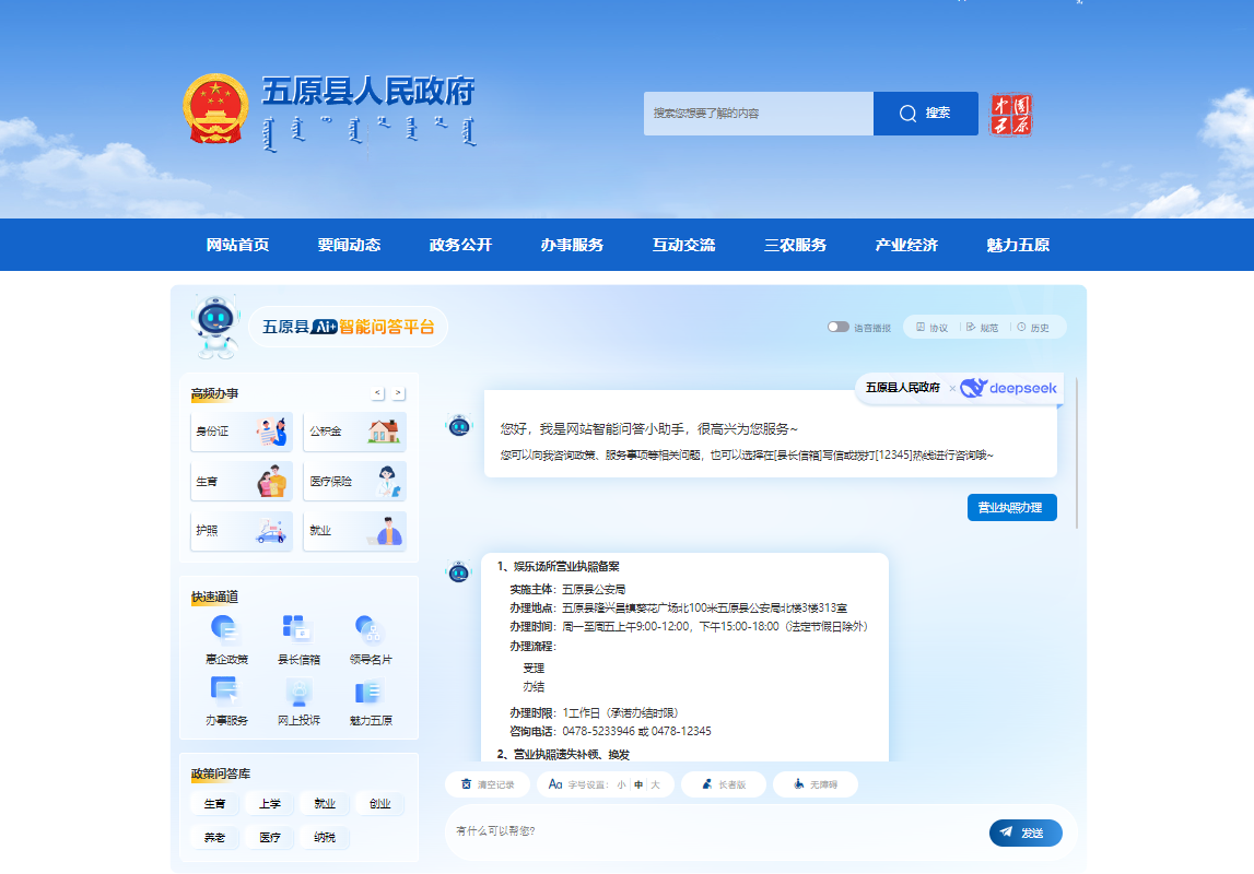 在数字化转型浪潮中,五原县积极拥抱人工智能技术,以DeepSeek为助力,深度融合政务服务,推动“智慧政务”建设迈向新高度。
