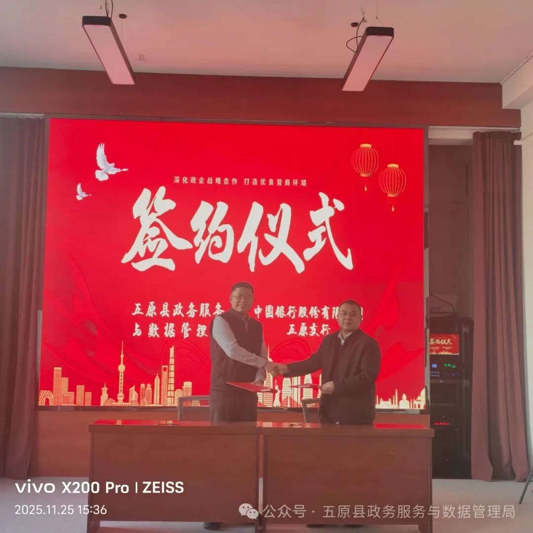 11月25日,五原县政务服务与据管理局和中国银行股份有限公司五原支行正式签约,联合推出“企业大礼包”。此次合作聚焦新开办企业开业初期“急难愁盼”,以“物质保障+全程服务”双轮驱动优化营商环境,开启县域企业服务新篇章。