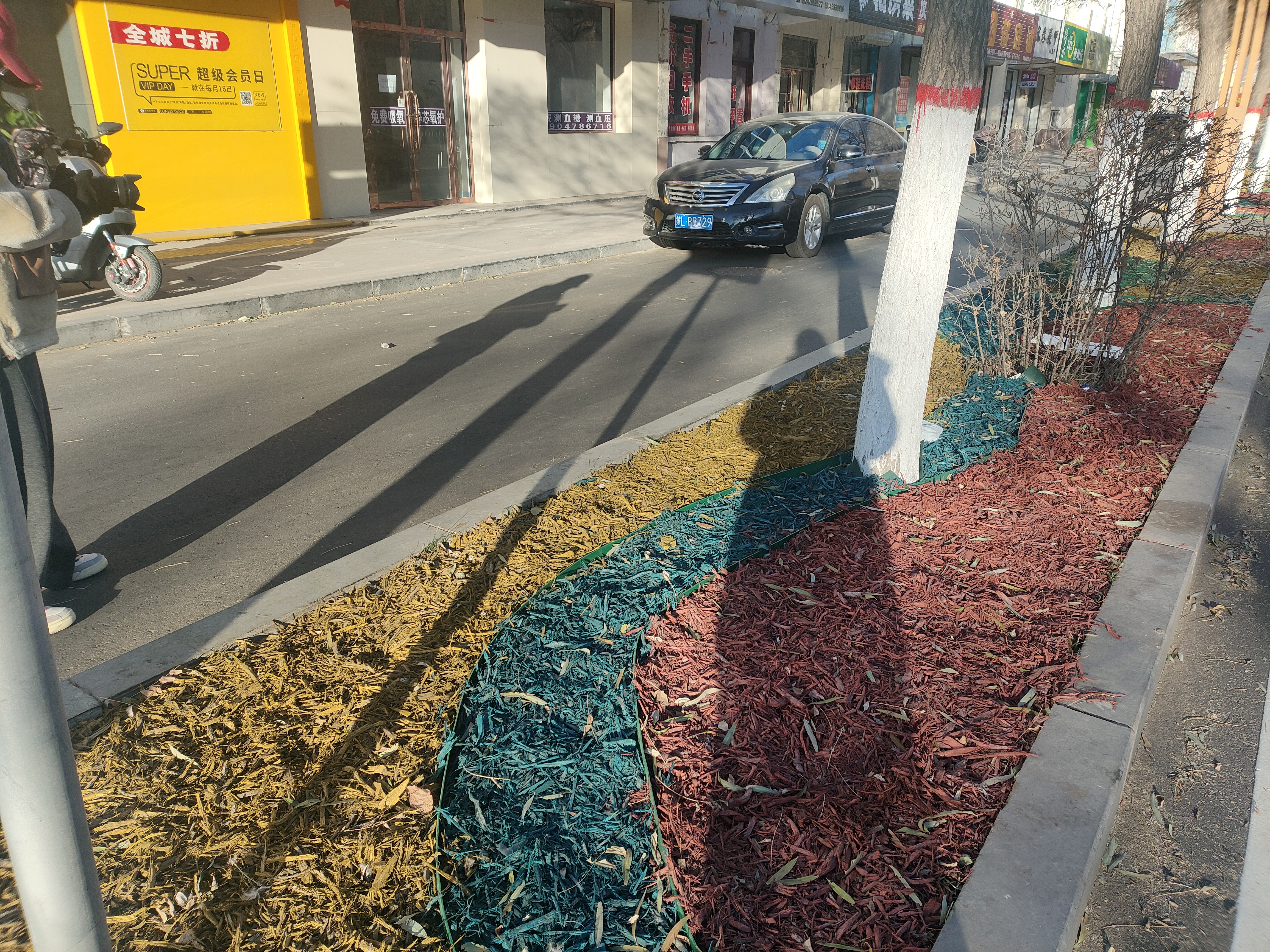 记者在五原县前进街路段看到,几名园林绿化工人正在为道路两旁的绿化带草坪铺设保温膜布,并用收边条做出图案造型,剩余工人则将细碎的彩色有机覆盖物均匀铺撒在造型轮廓内。经过工人的精心打理,原本裸露着泥土的绿地瞬间披上了“彩色新装”,成为街头一道亮丽的风景线。