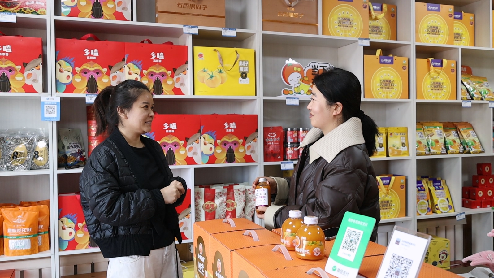 初春时节,走进古郡田园农民专业合作社特产店,记者看到货架上琳琅满目地摆满了黄柿子汁、玉米等各式各样的农特产品,店员们正忙着将一箱箱包装精美的特产打包发货,发往全国各地。