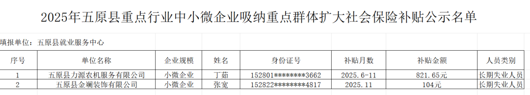 公示日期:2025年11月21日-11月27日,公示期为5个工作日,如对补贴发放有问题反映,请与五原县就业服务中心联系。