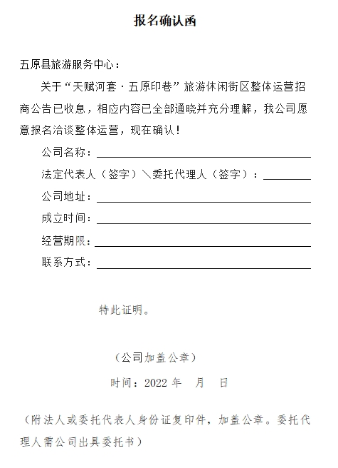 (四)有意合作的企业请在招商期限内将合作意向以企业正式文件的形式回函五原县旅游服务中心确认,未回函确认的不列入洽谈范围,联系方式如下: