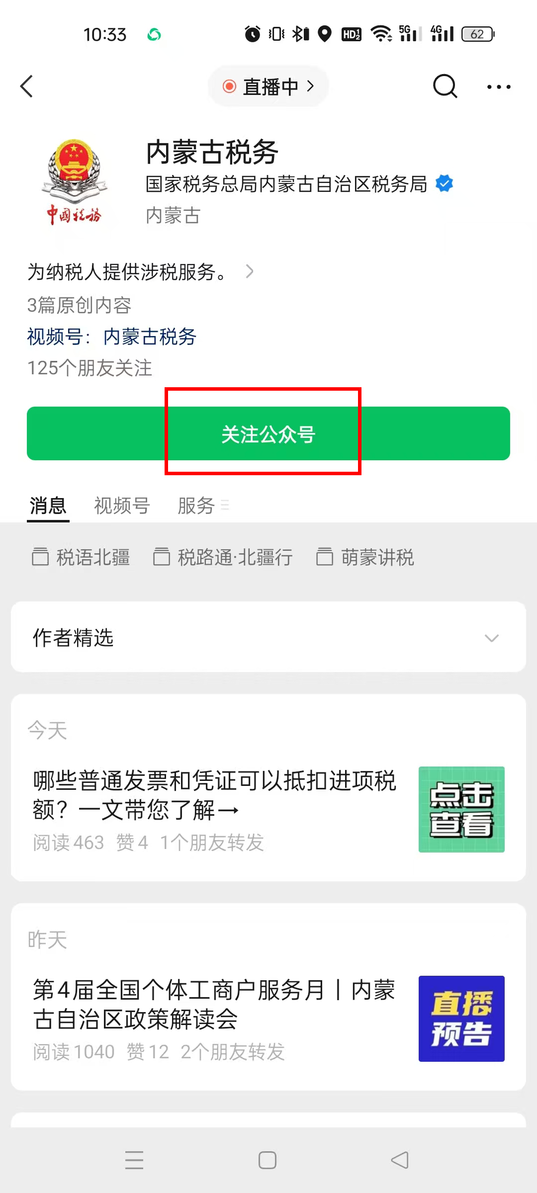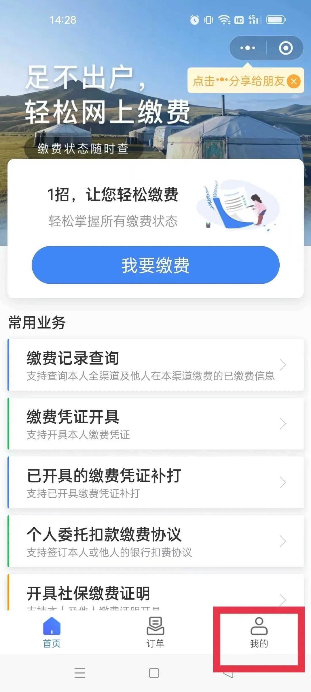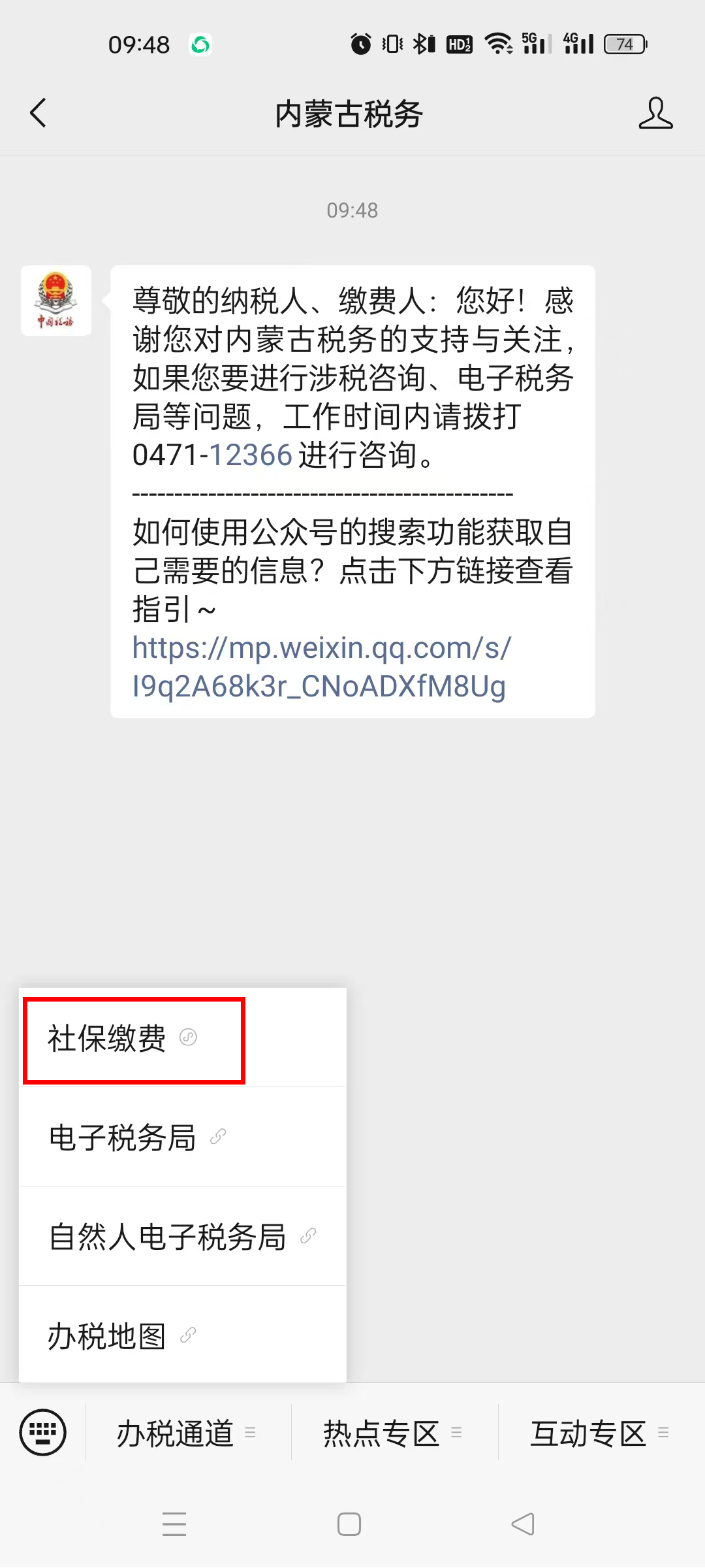 打开微信,搜索“内蒙古税务”并关注,点击底部模块“办税通道”——“社保缴费”