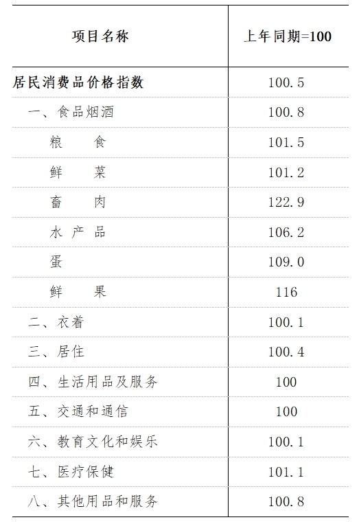 全县居民消费价格指数100.5%,商品零售价格指数和农业生产资料价格指数分别为100.3%、100.5%。八大类价格较上年均有不同程度的升降。(各类价格指数变动见附表一)