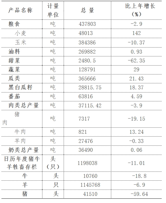 全县粮食总产量8.76亿斤,同比下降2.9%,其中:小麦总产量0.96亿斤,是去年同期的2.4倍,玉米产量7.69亿斤,同比下降10.37%,葵花产量5.4亿斤,同比增长0.93%,瓜类产量7.31亿斤,同比增长21.43%,黑白瓜籽产量0.58亿斤,同比增长18.37%,蔬菜产量2.58亿斤,同比增长29%。
