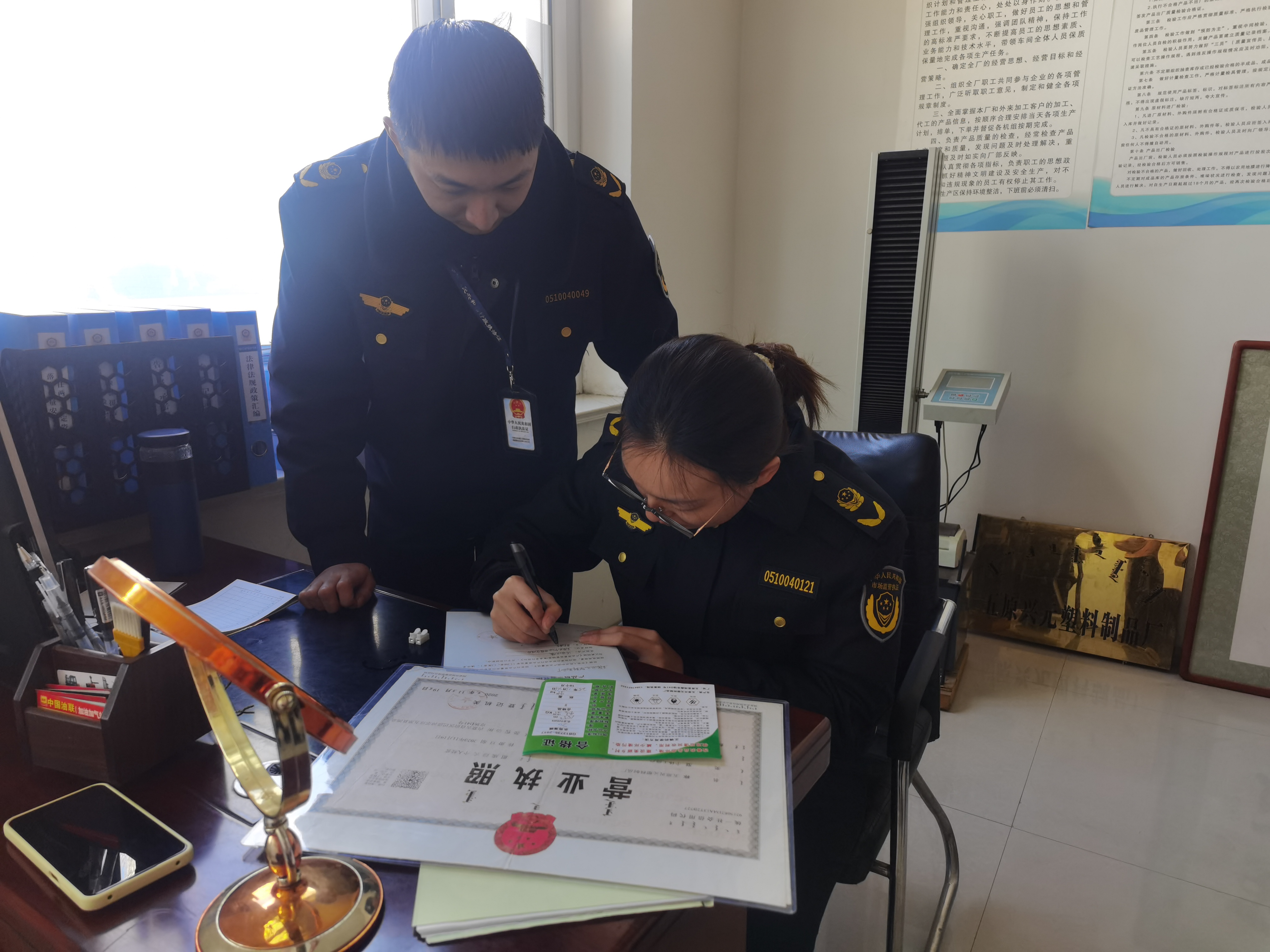 在兴元塑料制品厂生产车间内,12条生产线满负荷高速运转,自11月23日启动生产,企业便加足马力赶制20余吨地膜订单。执法人员严格按照相关国家标准,对地膜的厚度、拉伸强度、断裂伸长率、耐候性等关键质量指标进行逐项检测,并细致核查产品标识标注规范性。在成品仓库,执法人员还随机抽取两卷地膜完成封样送检,确保检测结果客观真实。