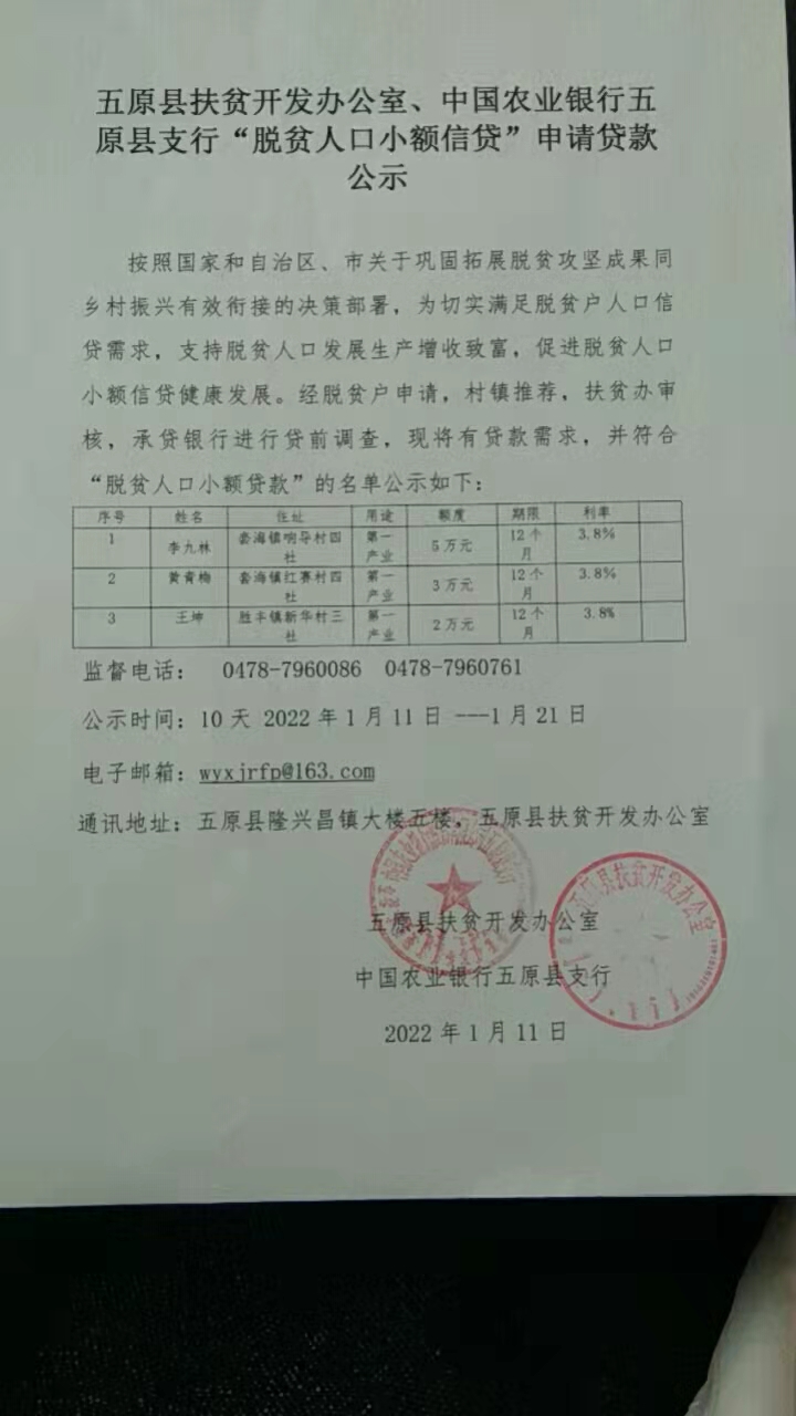 五原县扶贫开发办公室、中国农业银行五原县支行“脱贫人口小额信贷”申请贷款公示