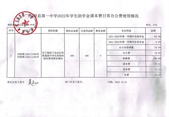 五原县第一中学2022年学生助学金课本费日常办公费使用情况