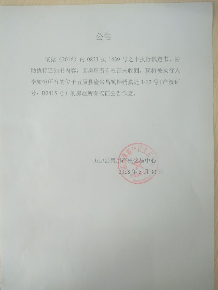 产权证号:B2415号(公告)