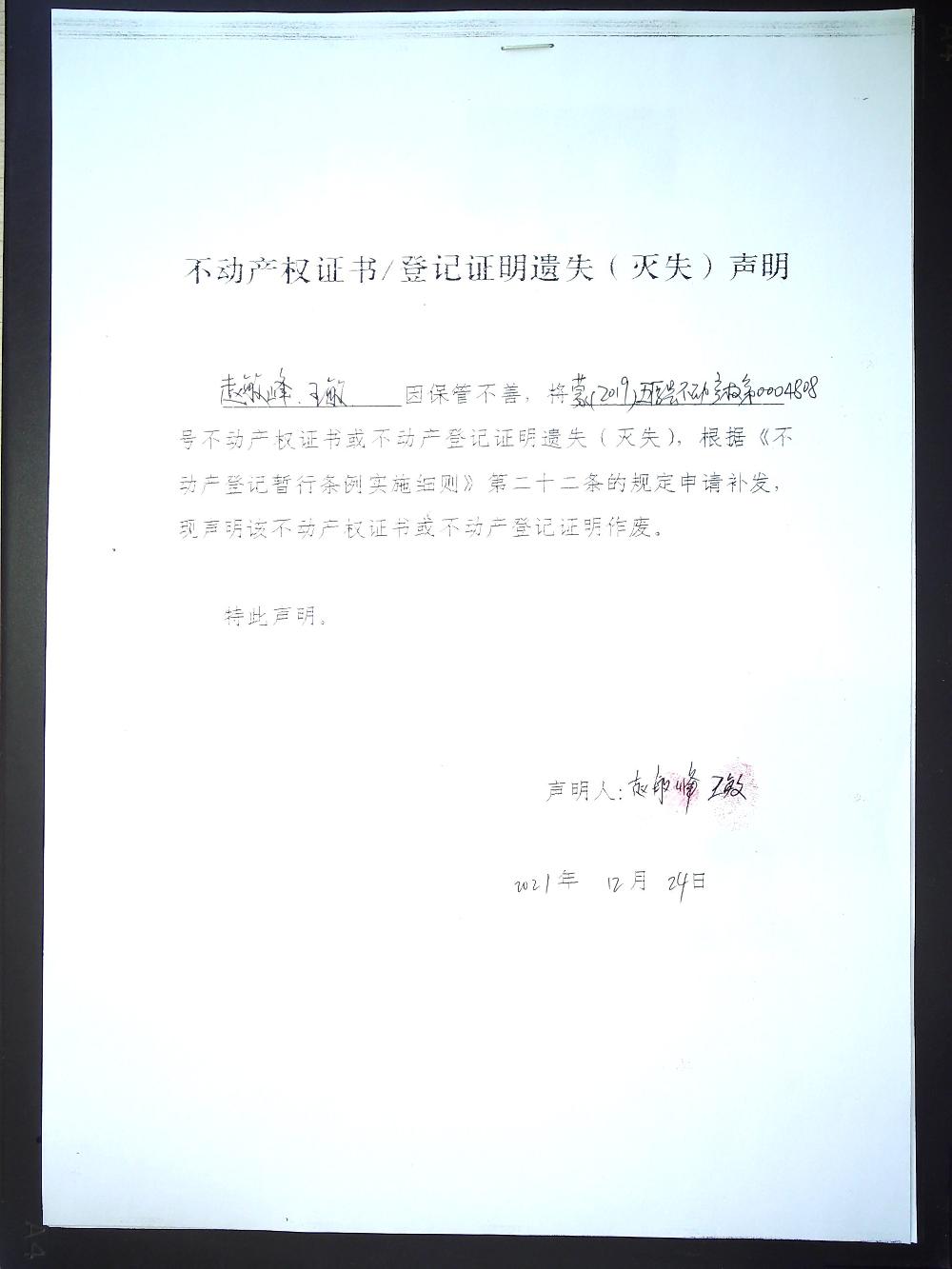 赵敏峰、王敏 遗失 蒙(2019)五原县不动产权第0004808号不动产权证