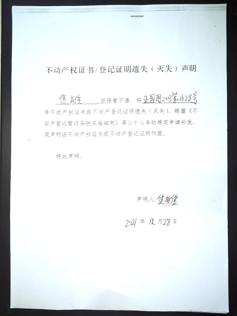 焦雄 遗失 五国用2013第1628号土地证