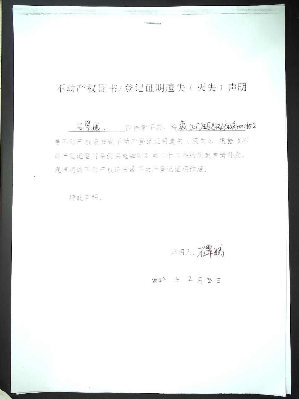 石翠娥 遗失:蒙(2017)五原县不动产权第0000652号