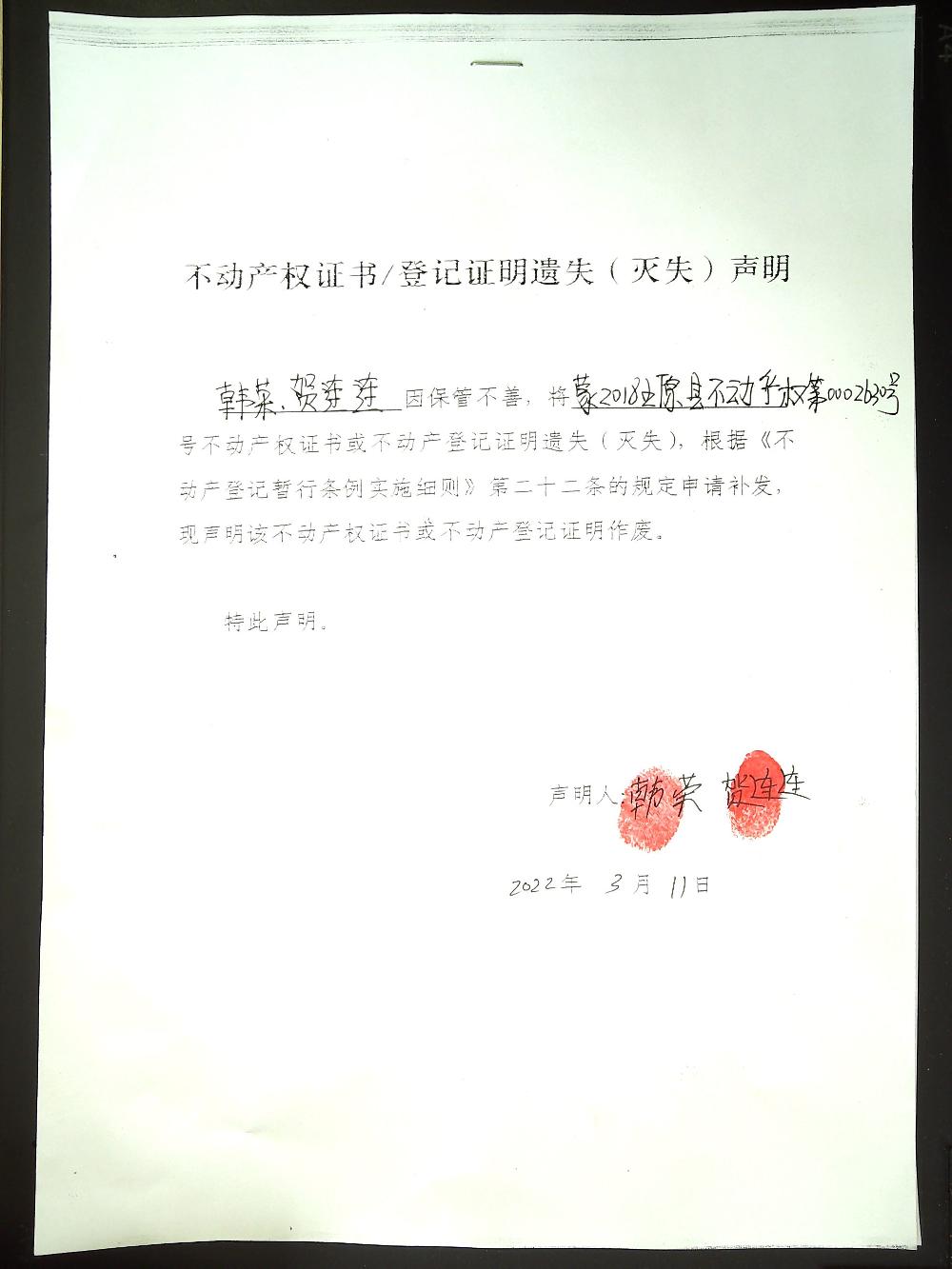 韩荣.贺连连 遗失:蒙2018五原县不动产权第0002630号不动产权证