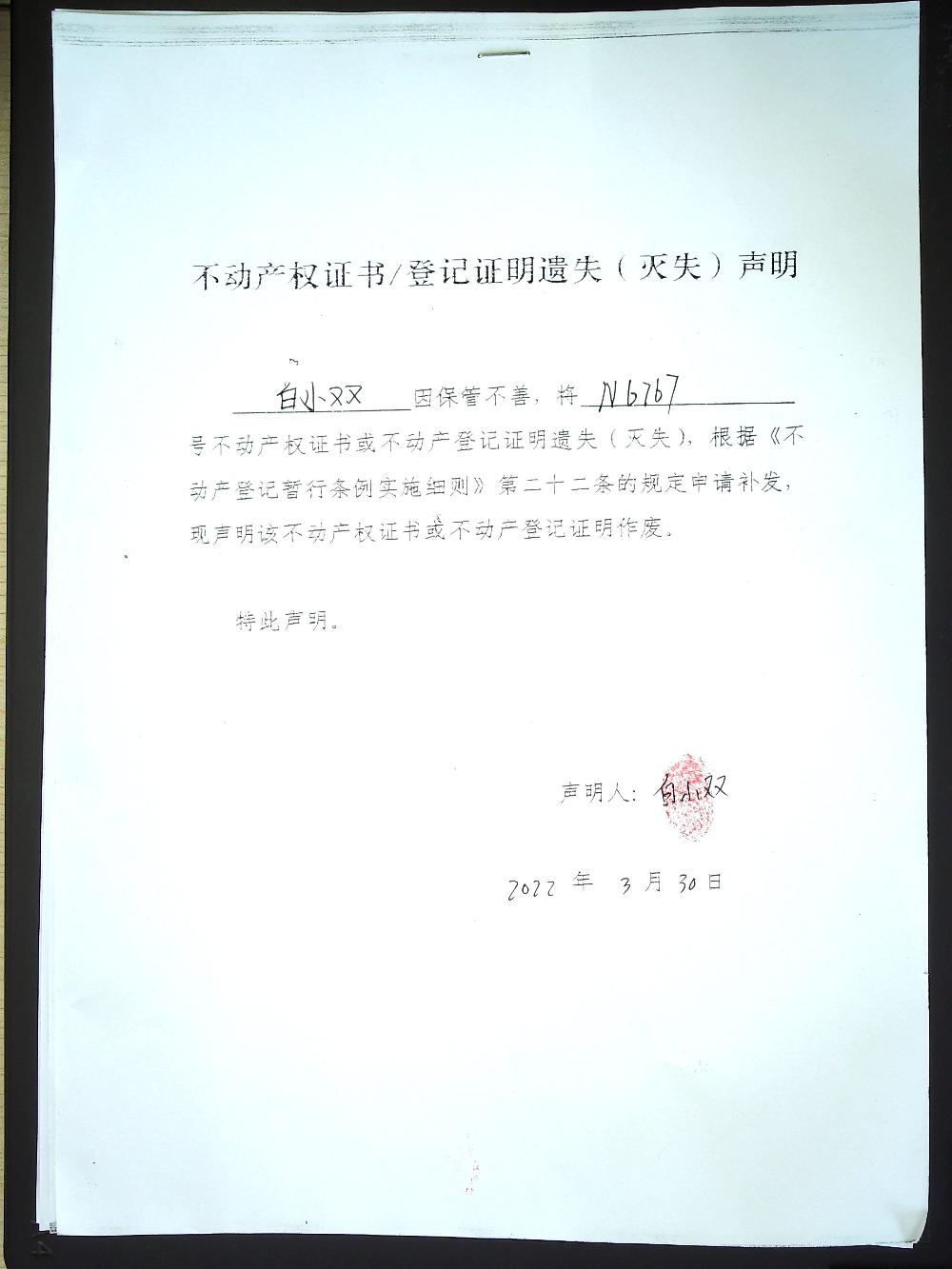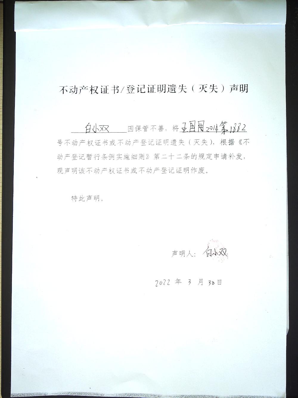 白小双遗失:N6767号房产证;五国用2014第1882号土地证。