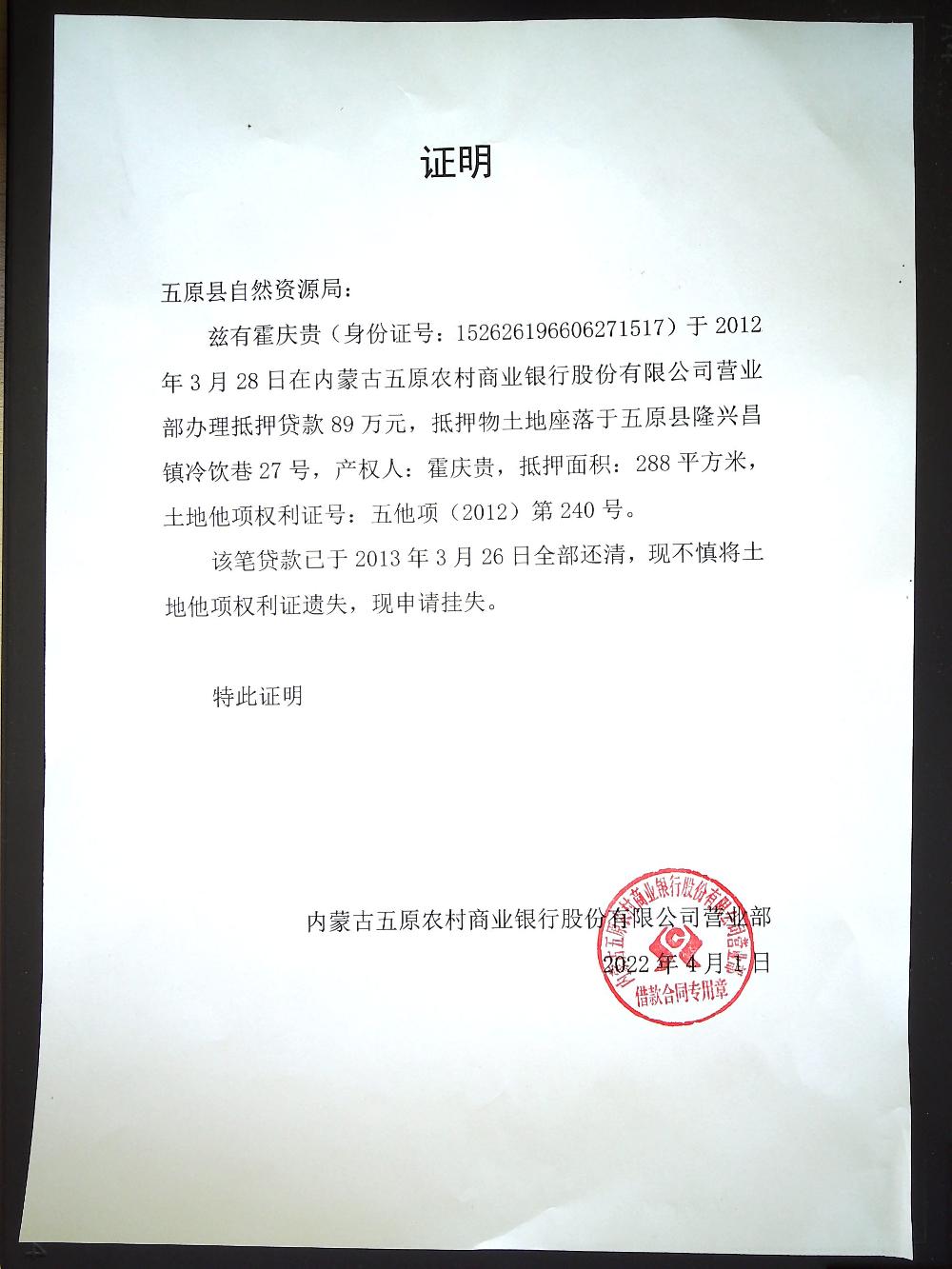 遗失霍庆贵五原县隆兴昌镇冷饮巷27号土地他项权利证号:五他项(2012)第240号。