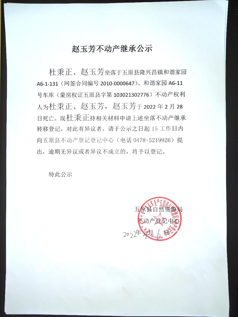 赵玉芳不动产继承公示:和谐家园A6-1-131(网签合同编号2010-0000647)、和谐家园A6-11号车库(蒙房权证五原县字第103021302776).