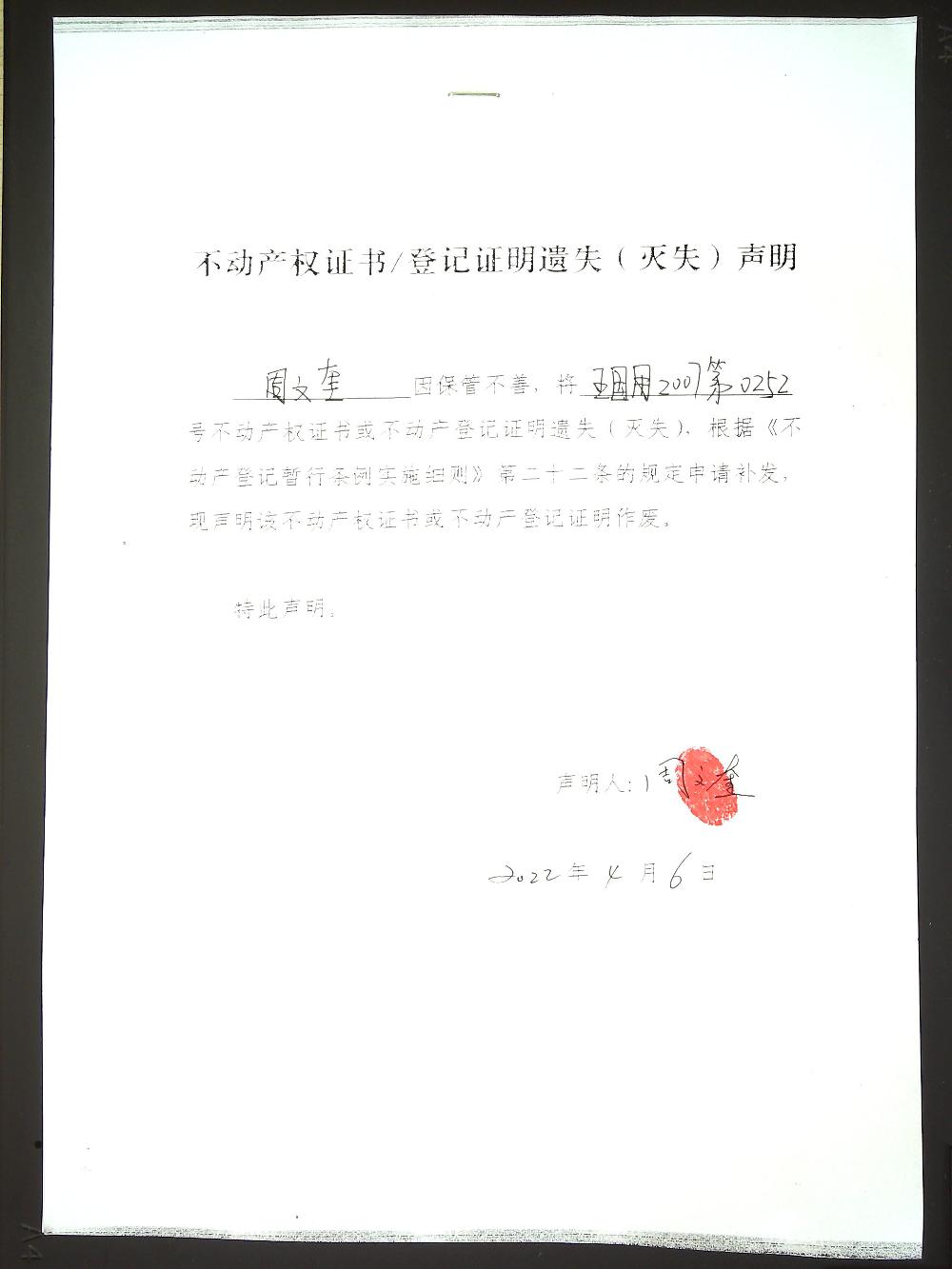 周文奎遗失:五国用2007第0252号土地证