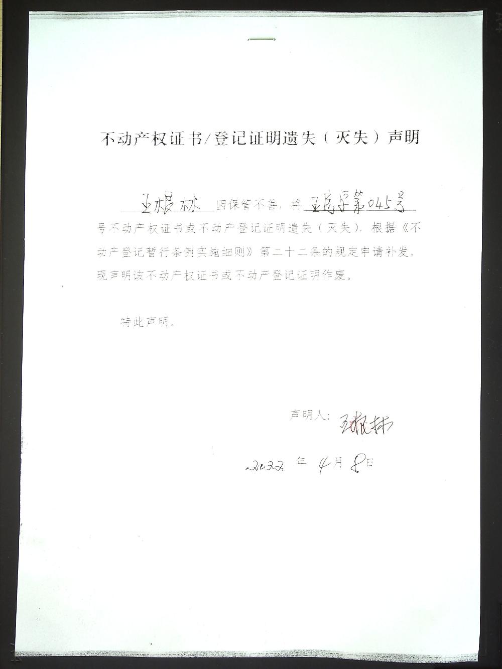 王根林 遗失:五房字第045号房产证;152822502-A-9号土地证。