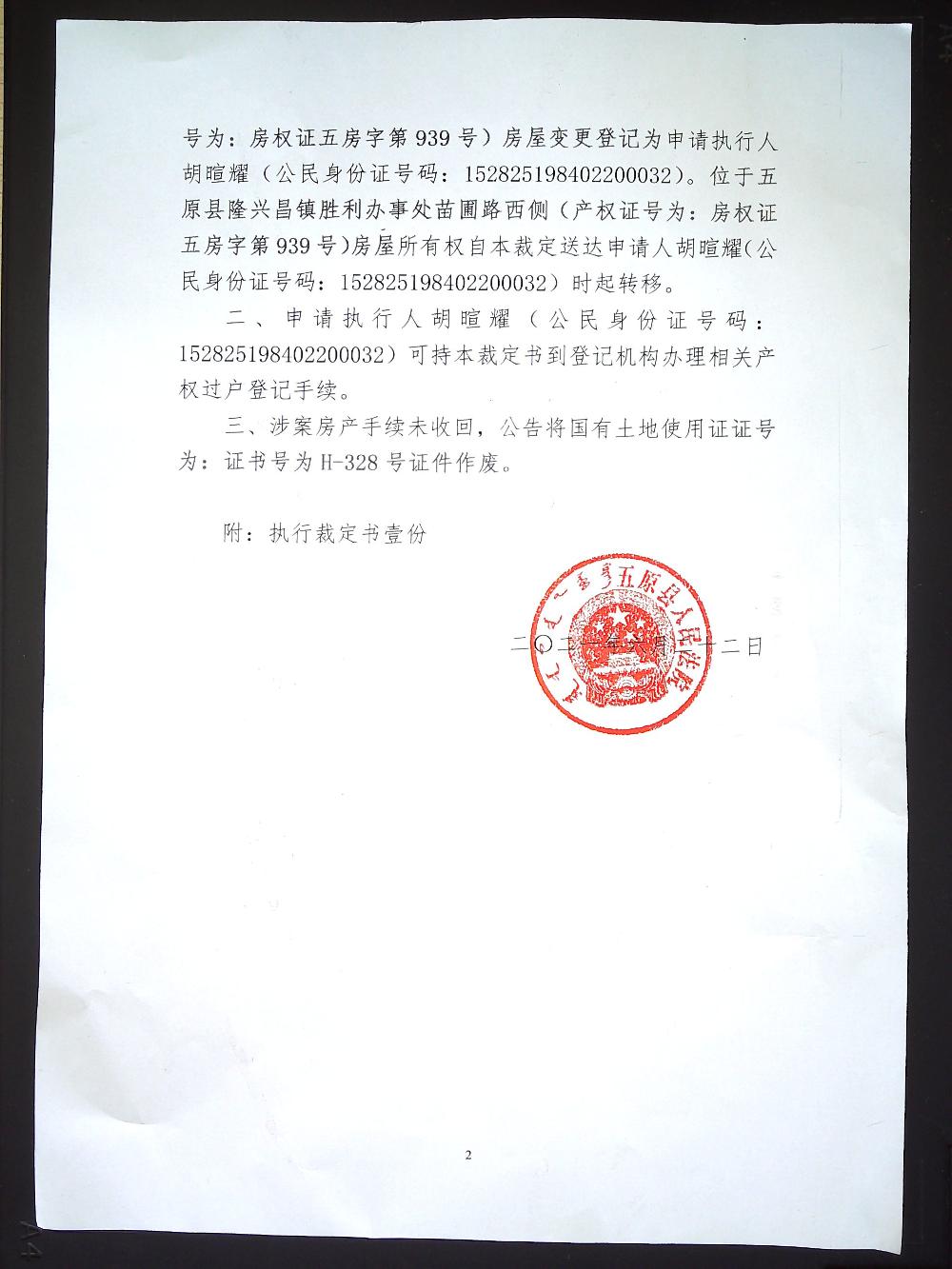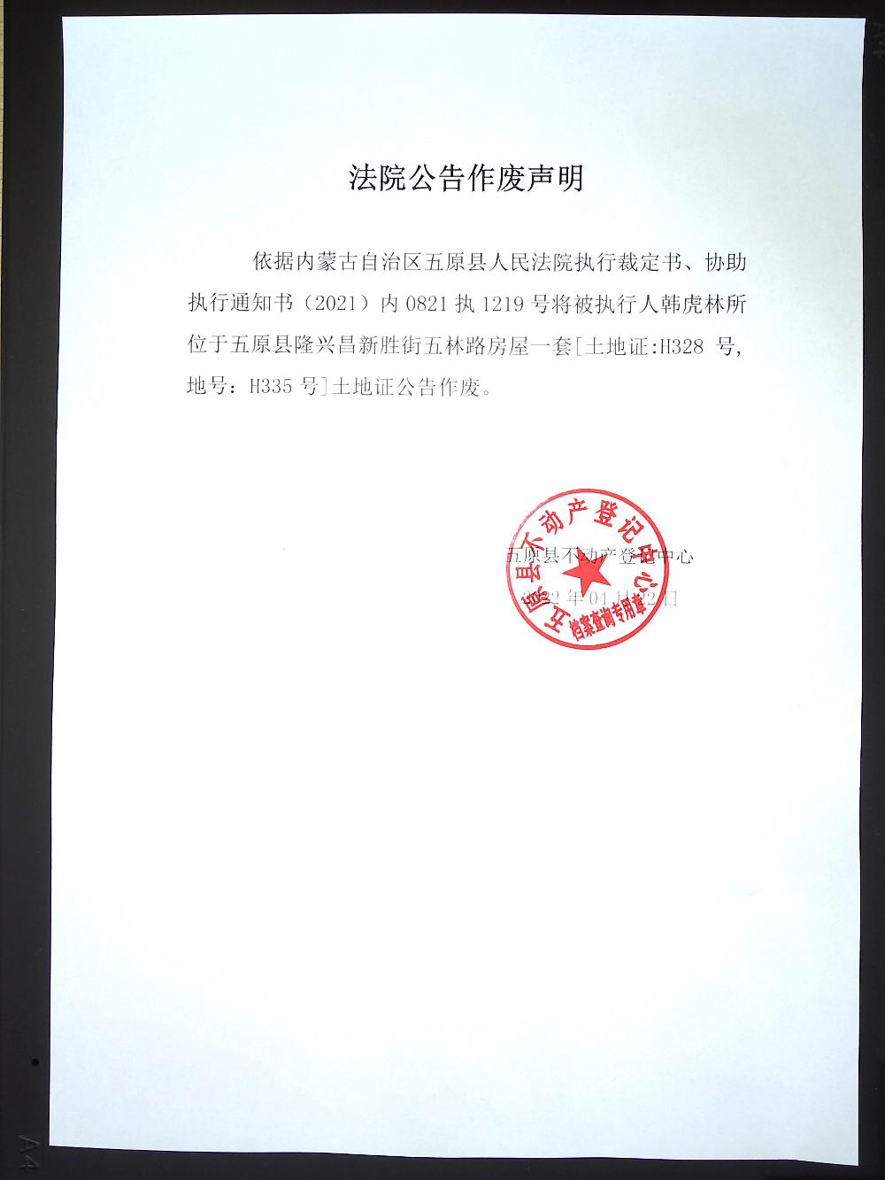 法院公告作废声明:韩虎林位于五原县隆兴昌新胜街五临路房屋一套【土地证:H328号,地号:H335号]土地证公告作废.