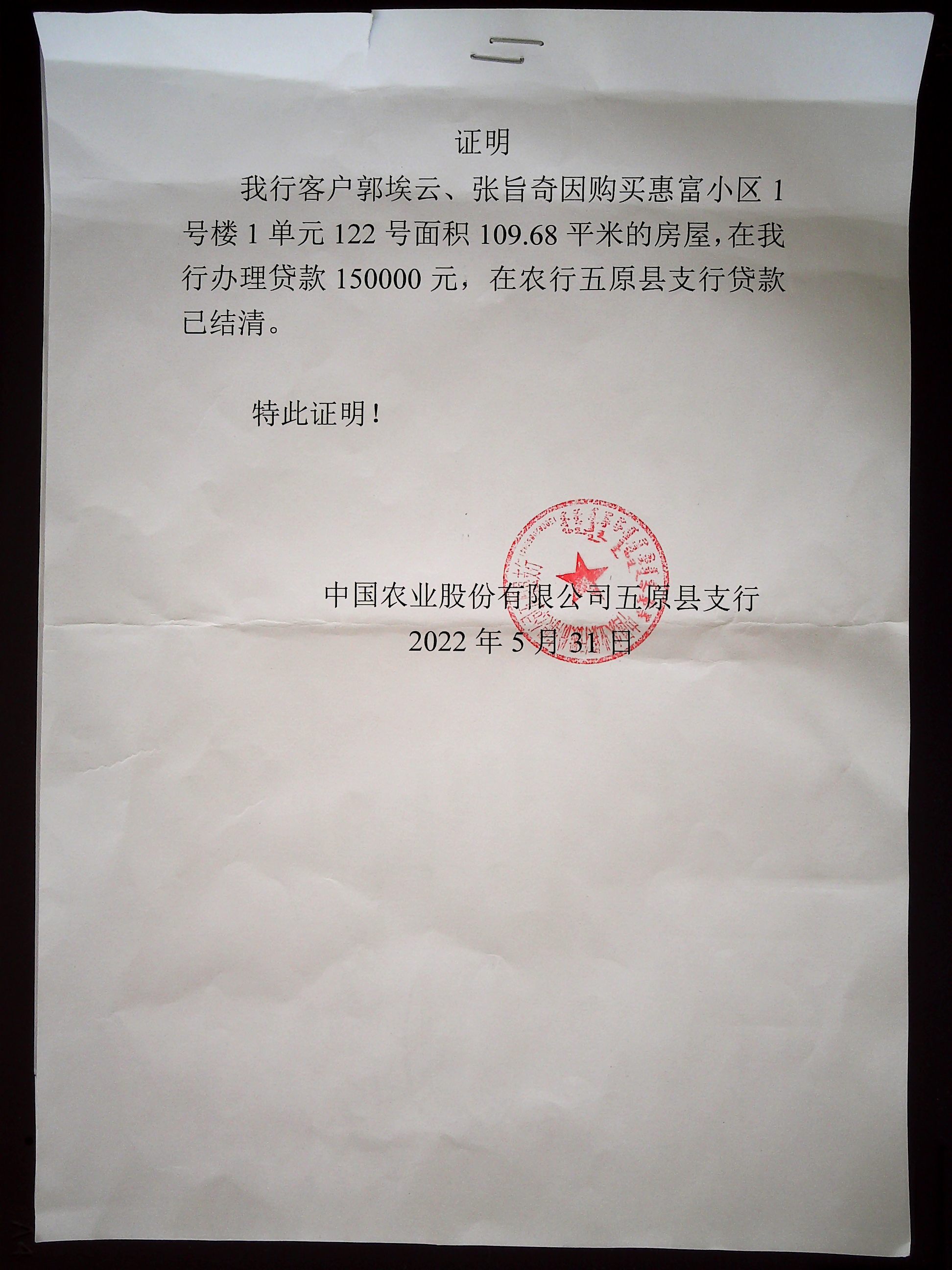 证明:郭埃云、张旨奇在农行五原县支行贷款结清证明