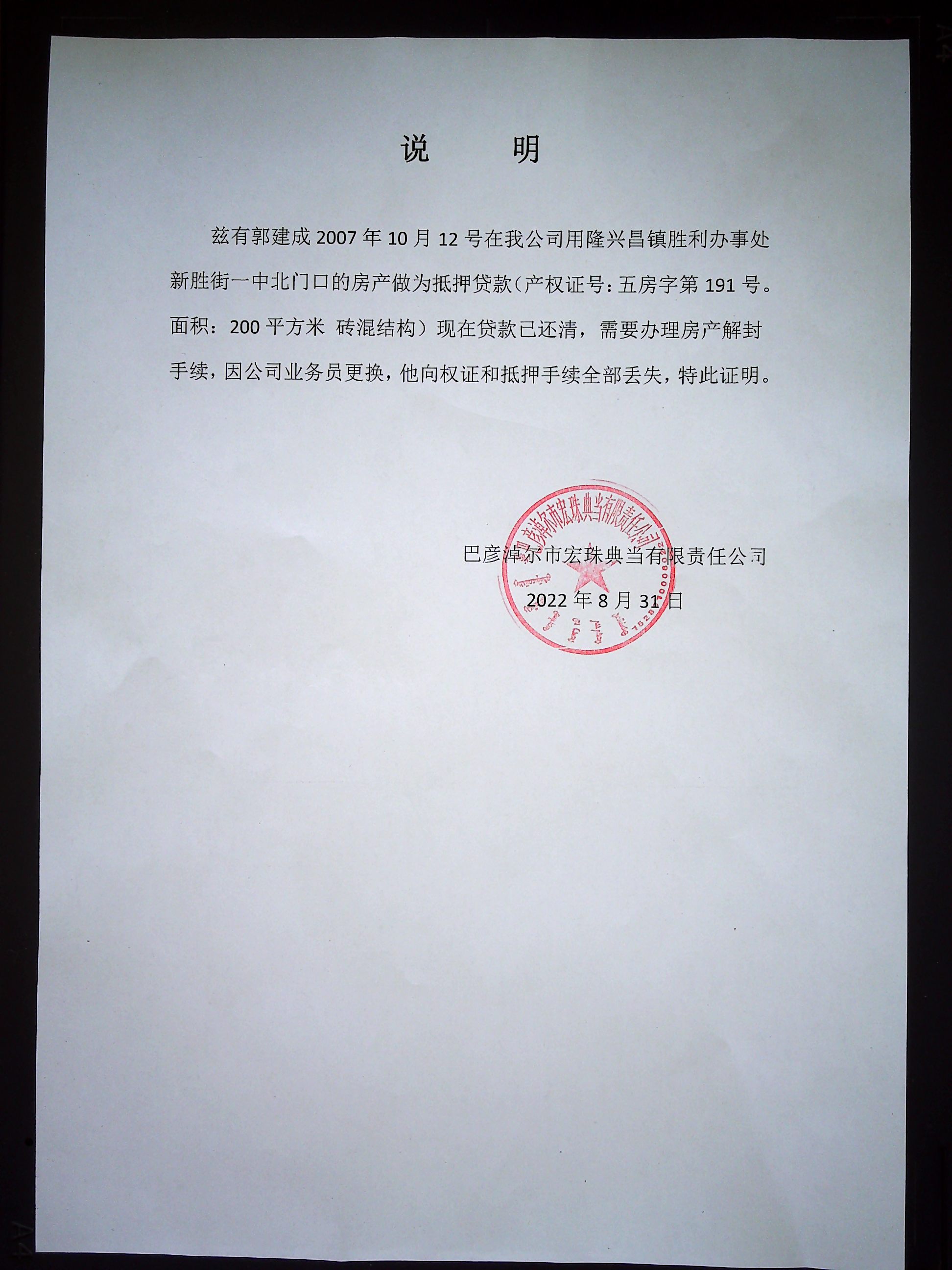 宏珠典当有限责任公司遗失:郭建成他项权证和抵押手续