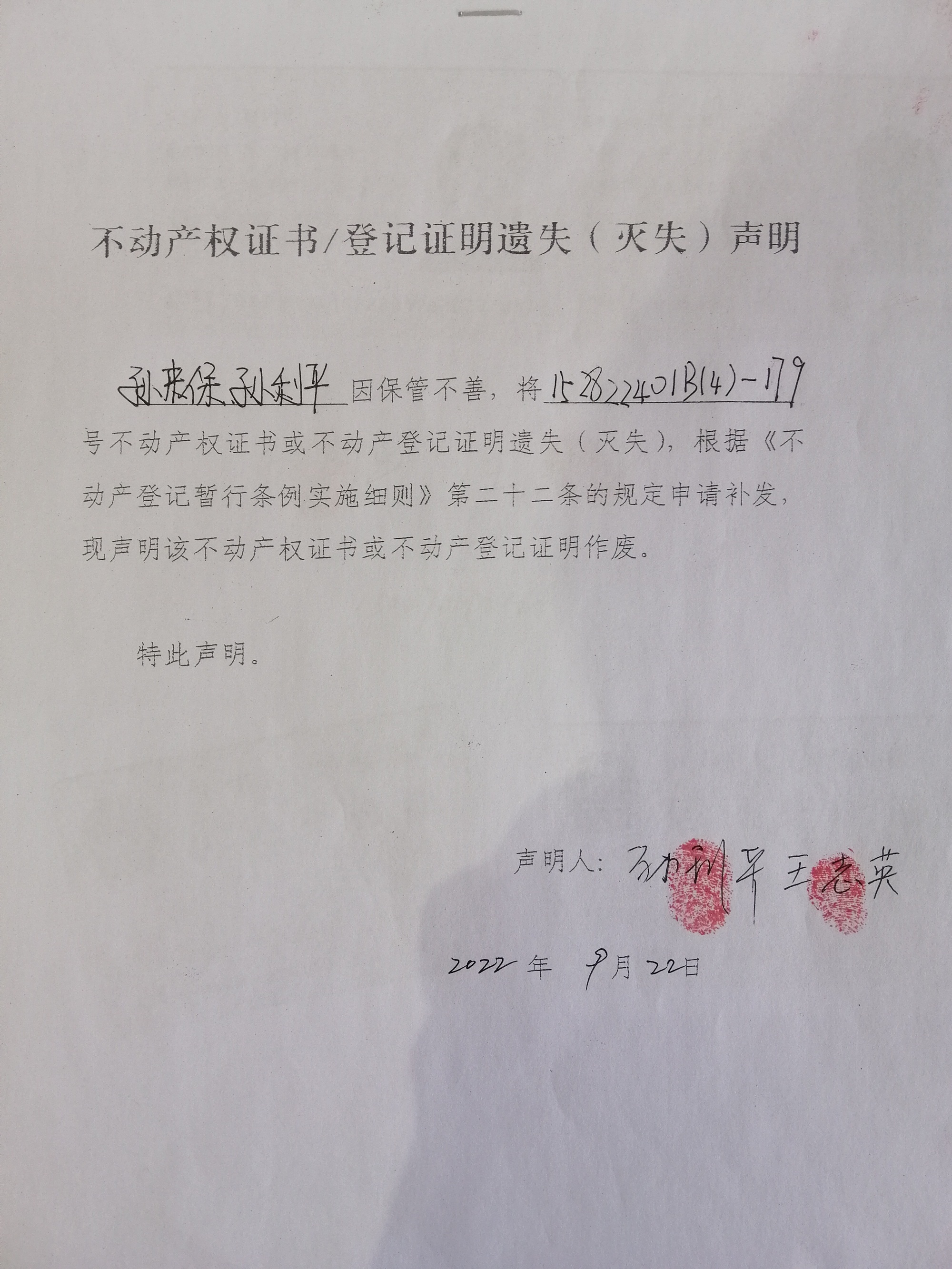 遗失:孙来保、孙利平,152822401B(4)—179号产权证
