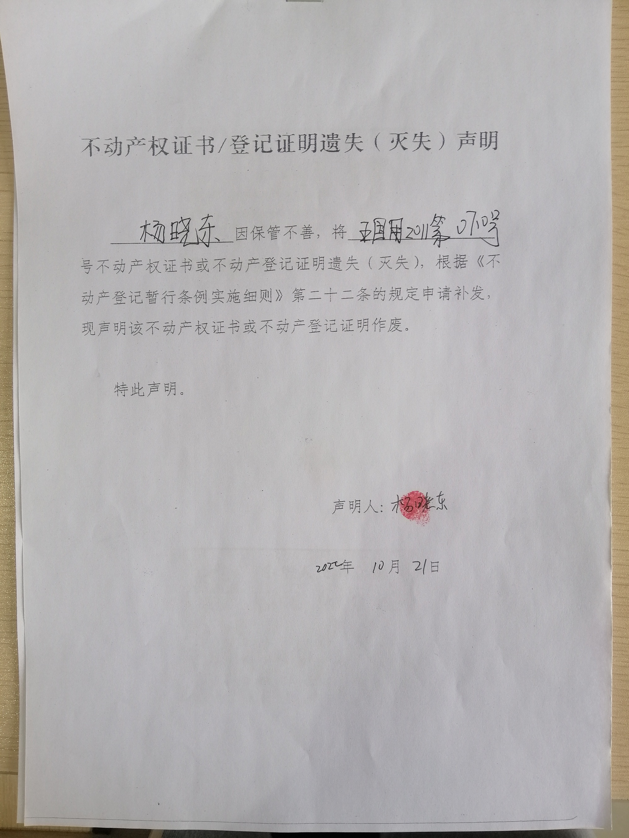 杨晓东 遗失:五国用2011第0710号