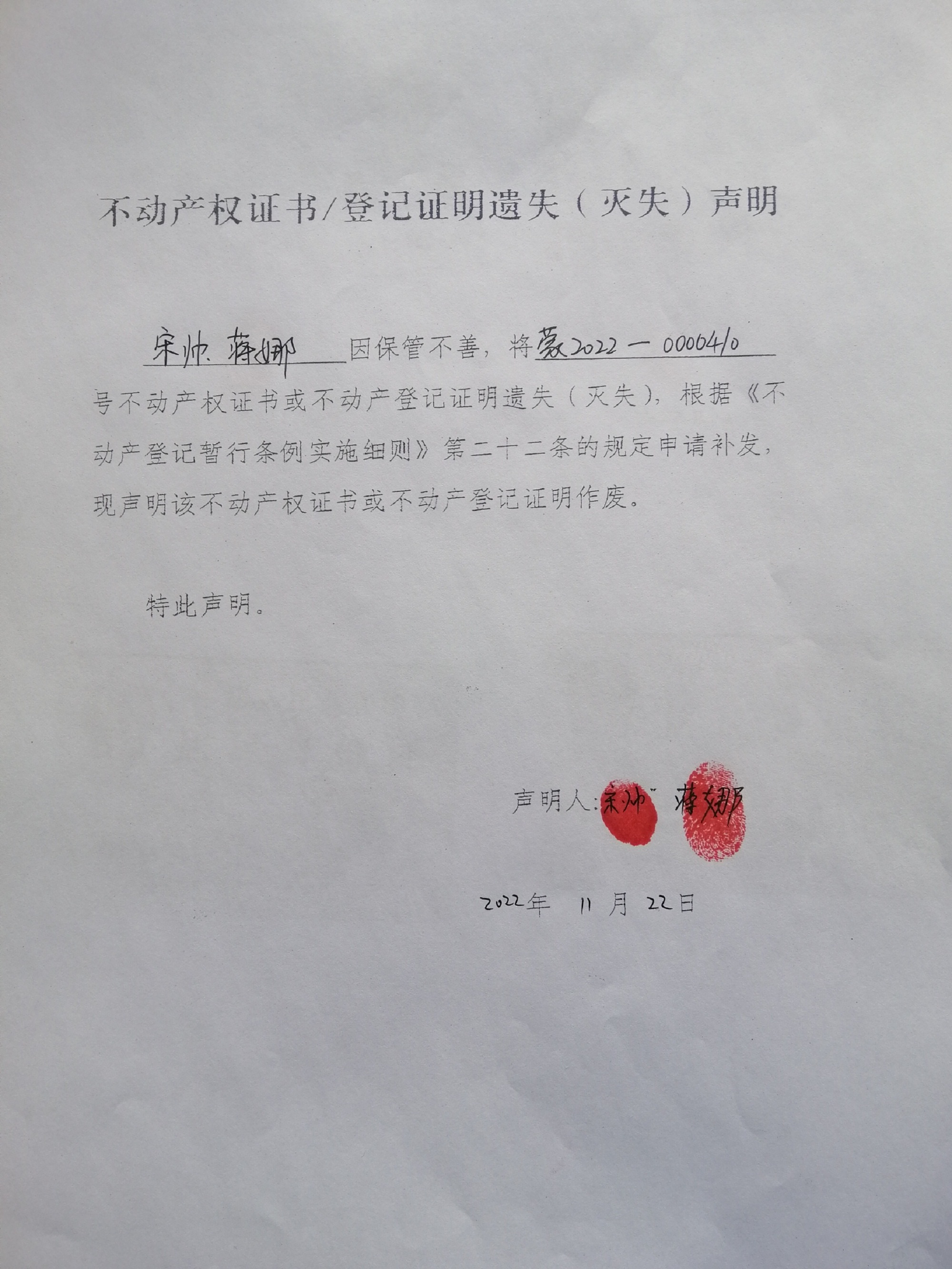 宋帅、蒋娜 遗失:蒙2022—0000410号不动产权证书