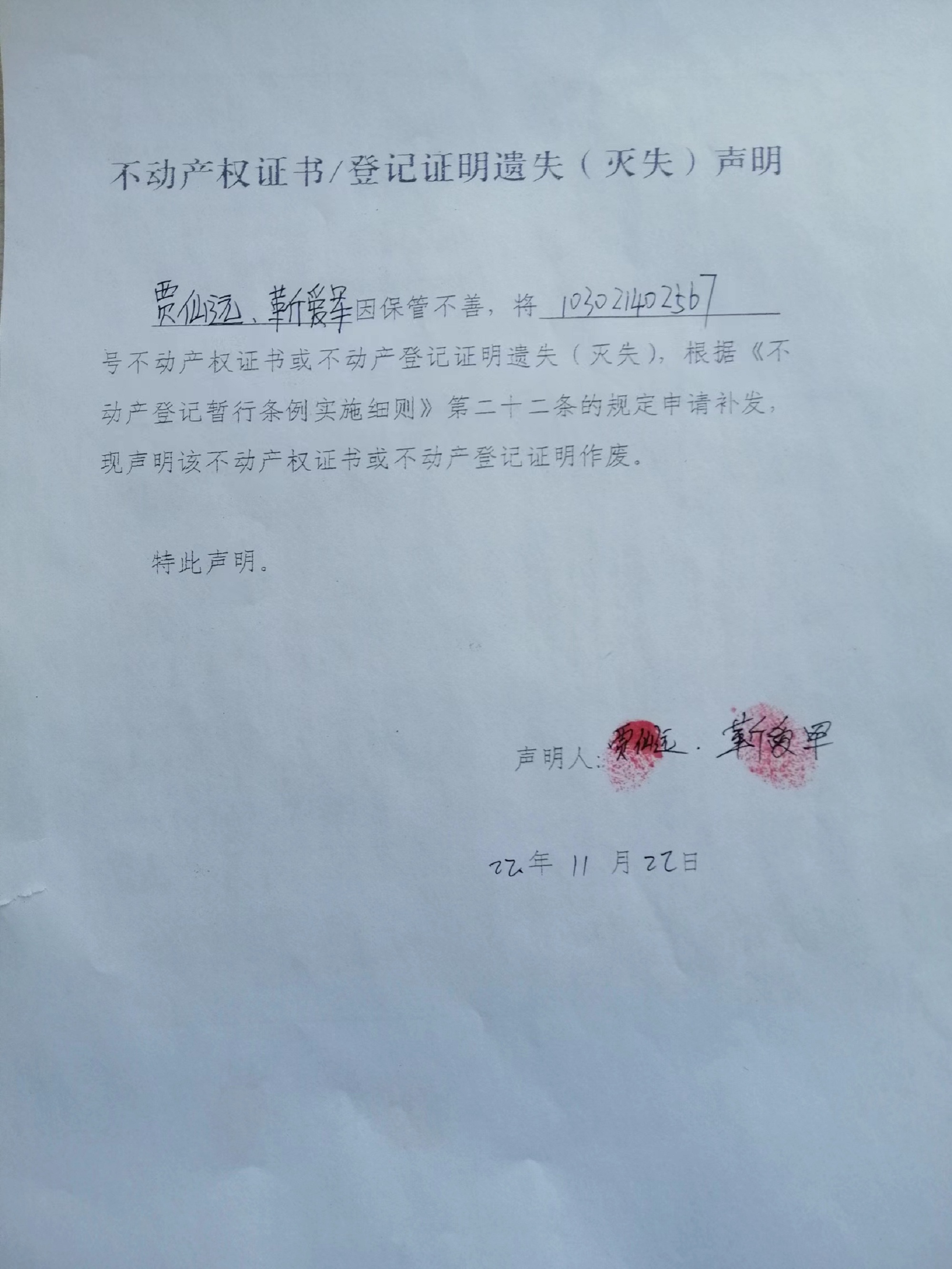 贾仙远、靳爱军 遗失:103021402567号产权证