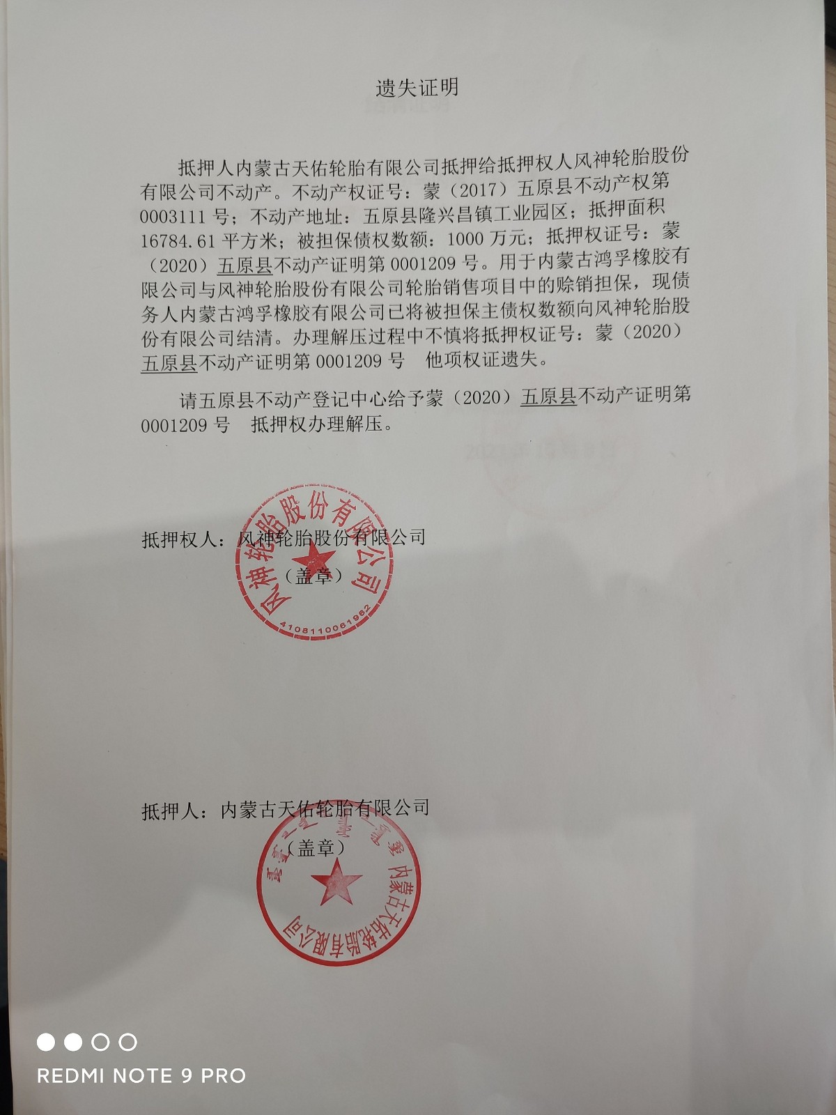 遗失内蒙古天佑轮胎有限公司抵押证明 蒙2020五原县不动产权证明第0001209号