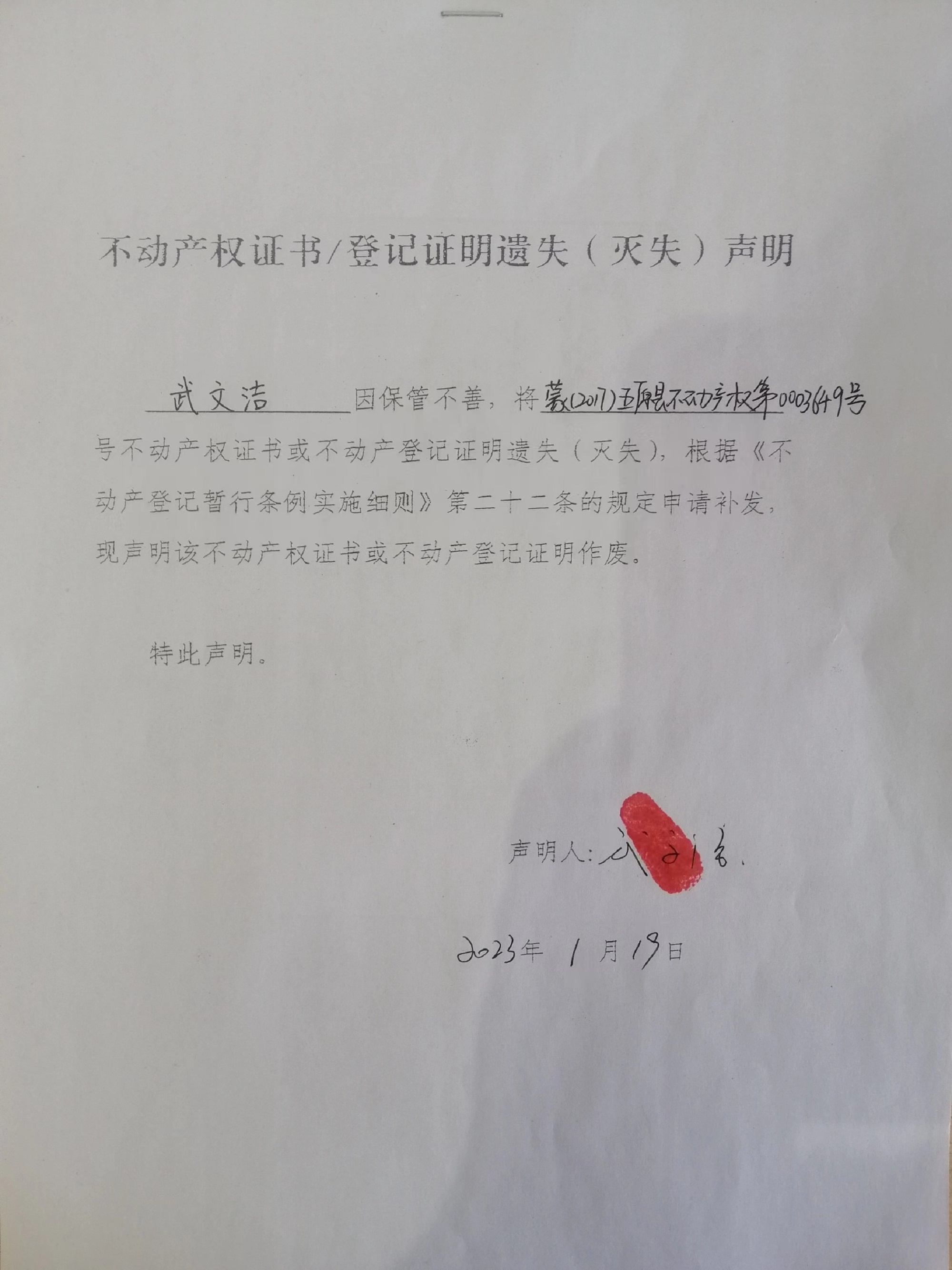 武文洁 遗失:蒙(2017)五原县不动产权第0003649号