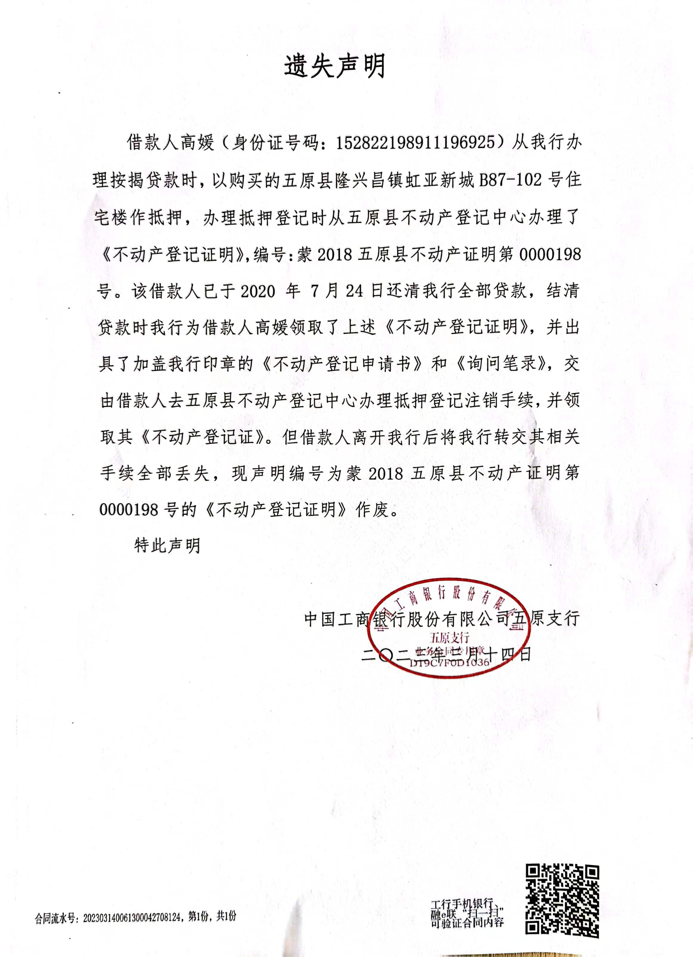中国工商银行股份有限公司五原支行 遗失:高媛他项权证