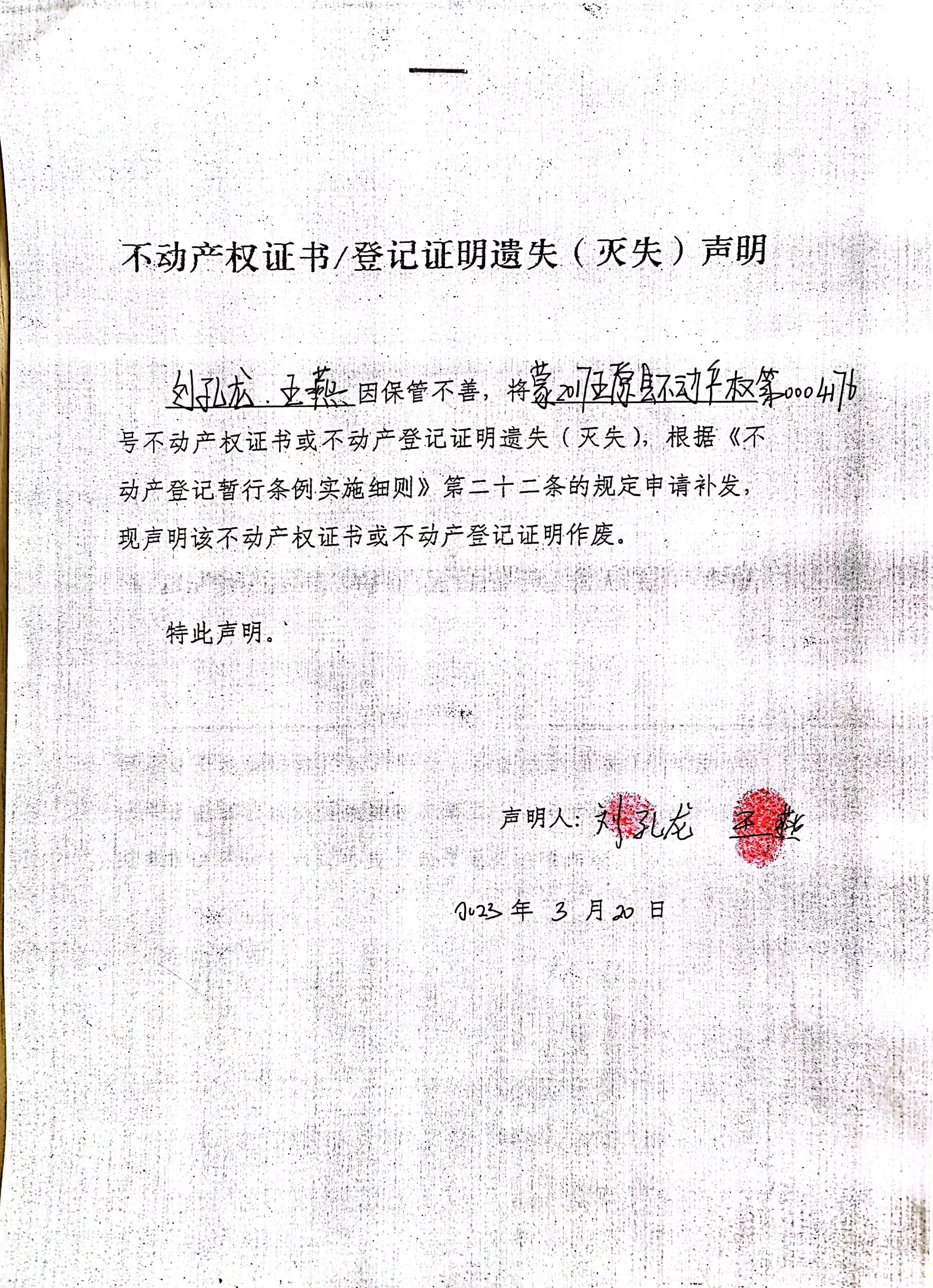 刘孔龙、王燕 遗失:蒙2017五原县不动产权第0004176号