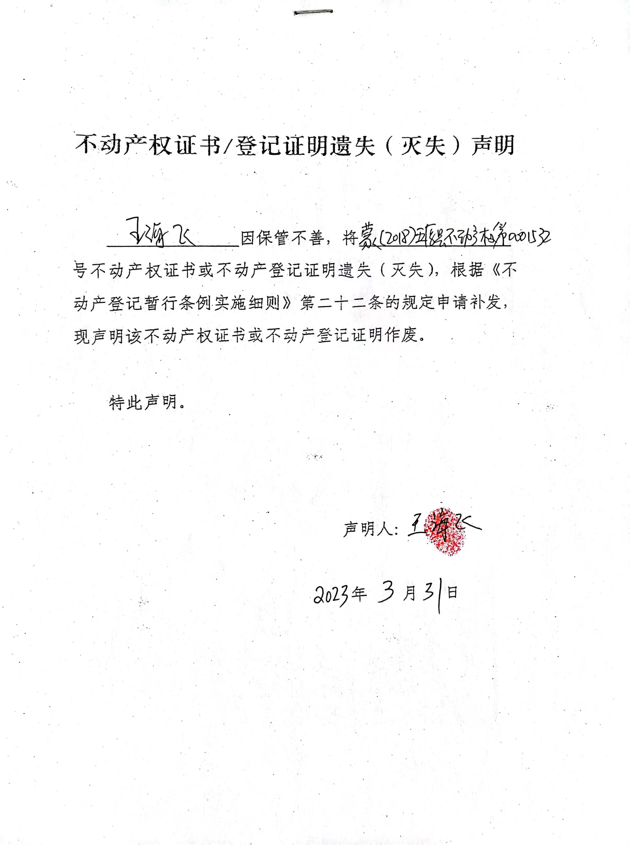 王海飞 遗失:蒙2018五原县不动产权第0001532号