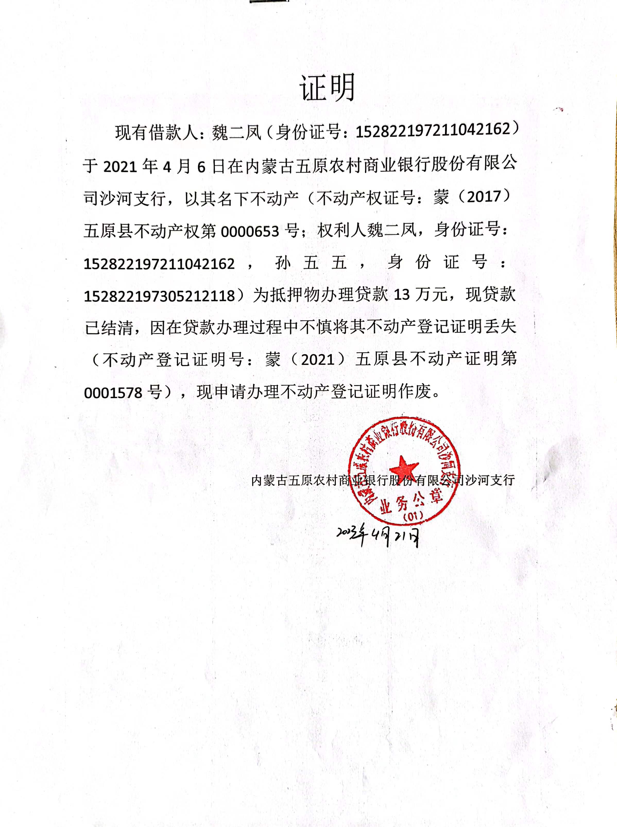 内蒙古五原农村商业银行股份有限公司沙河支行 遗失:魏二凤他项权证