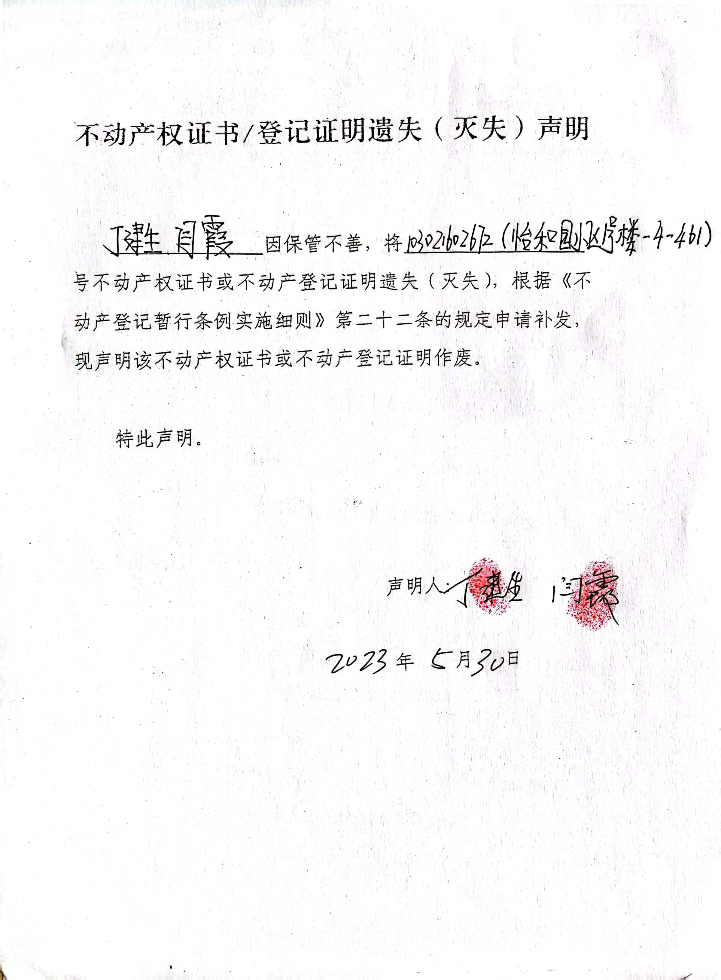 丁建生、闫霞 遗失:103021602672号