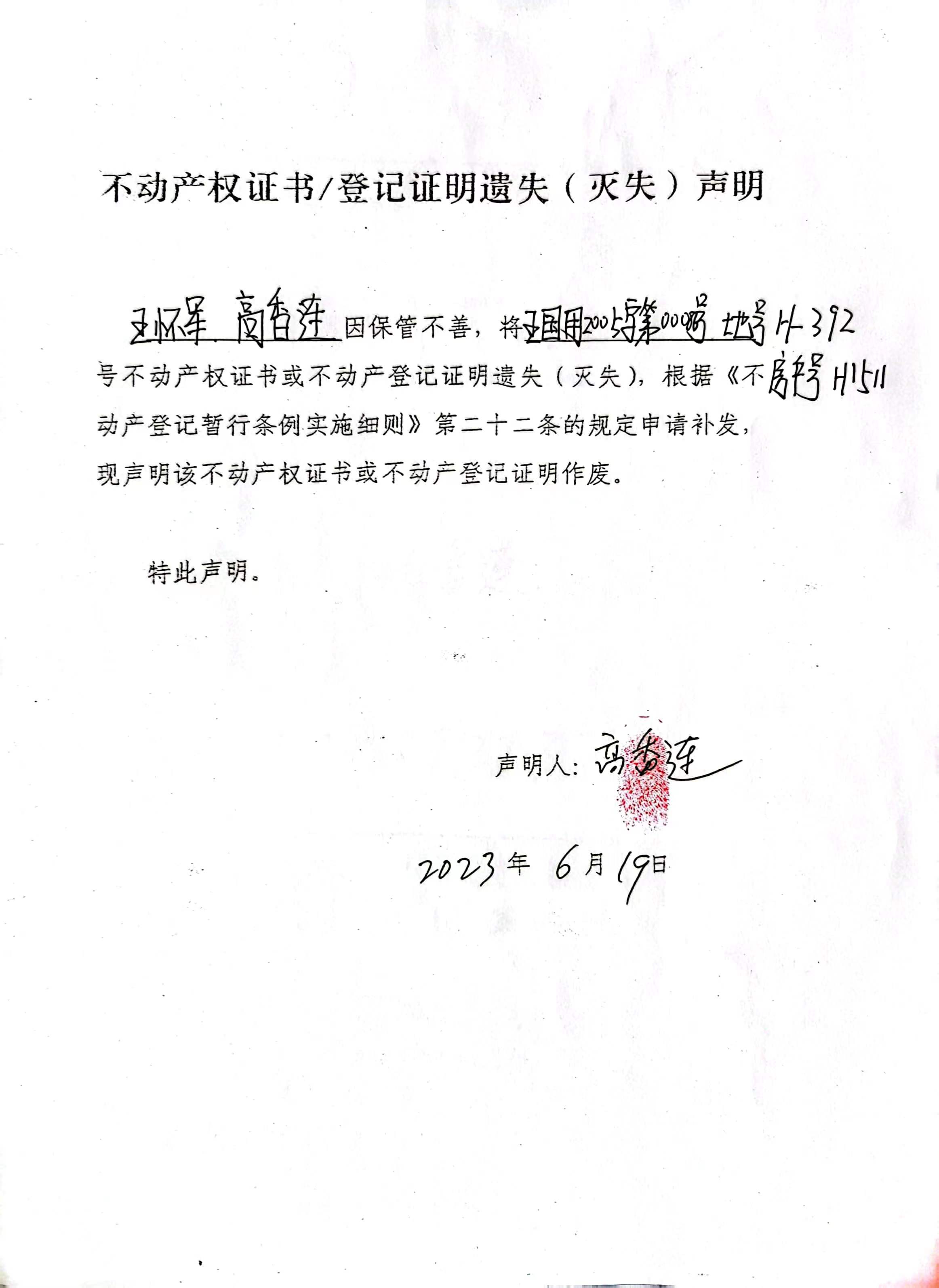 王怀军、高香连 遗失:五国用2005字第00086号,地号:H-392,房产号:H1511