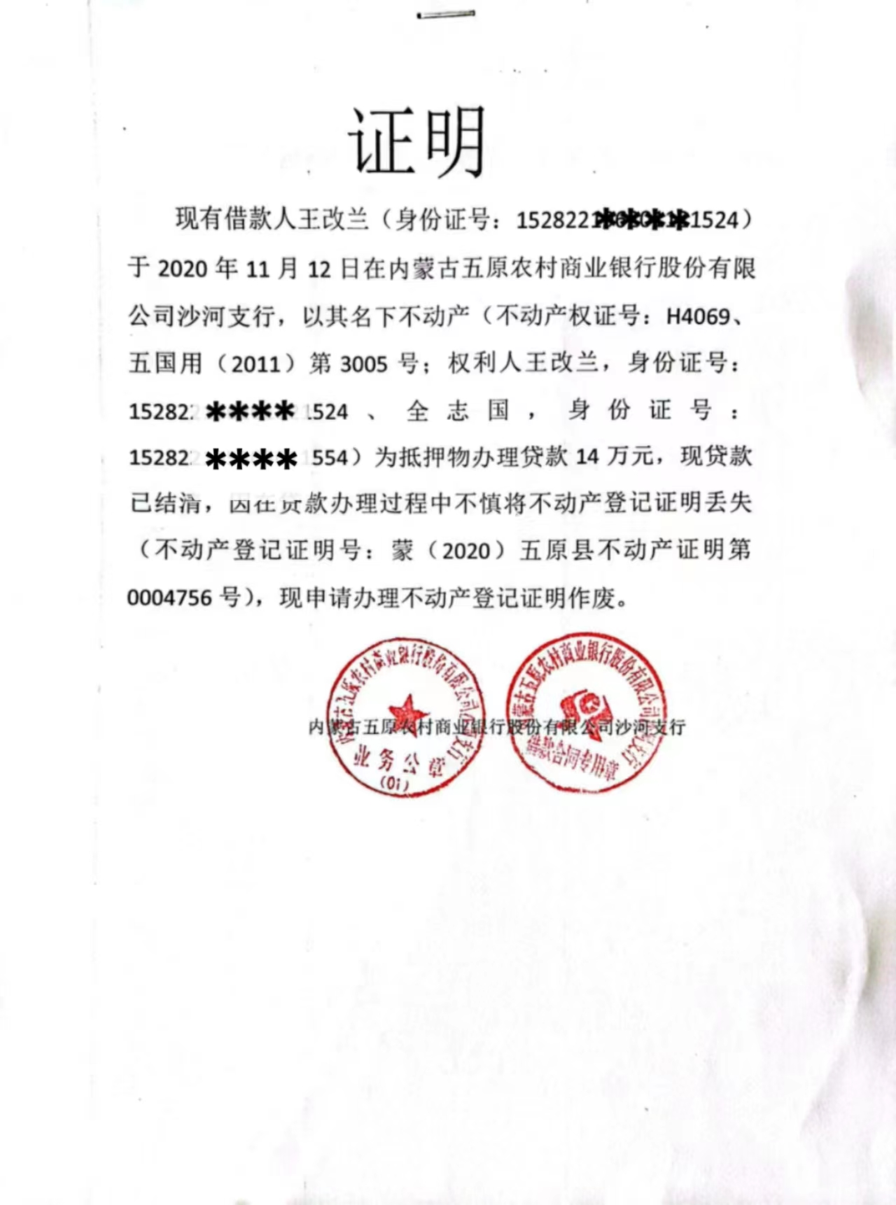 内蒙古五原农村商业银行股份有限公司沙河支行 遗失:王改兰的他项权证