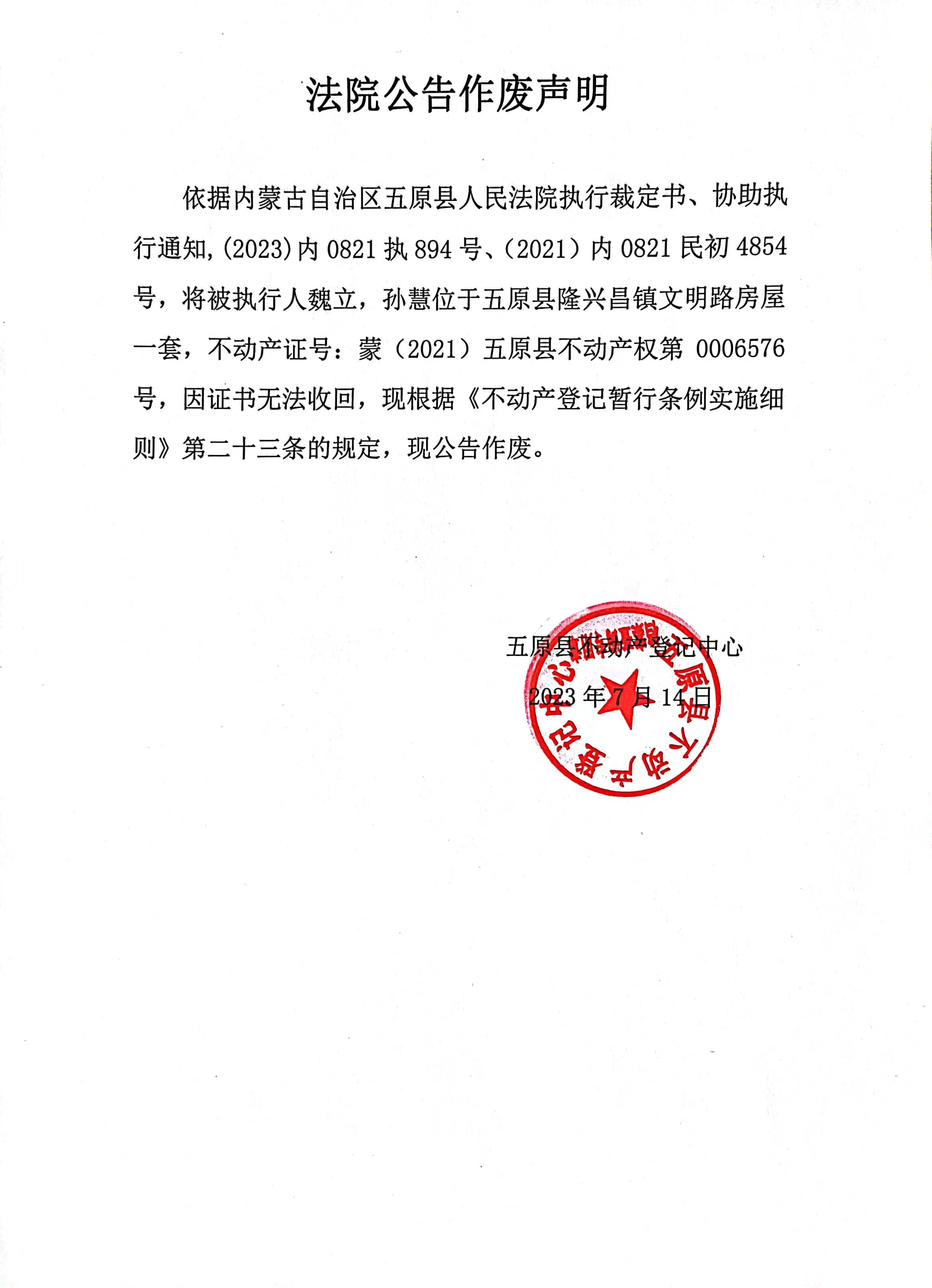 法院公告作废 声明 魏立、孙慧