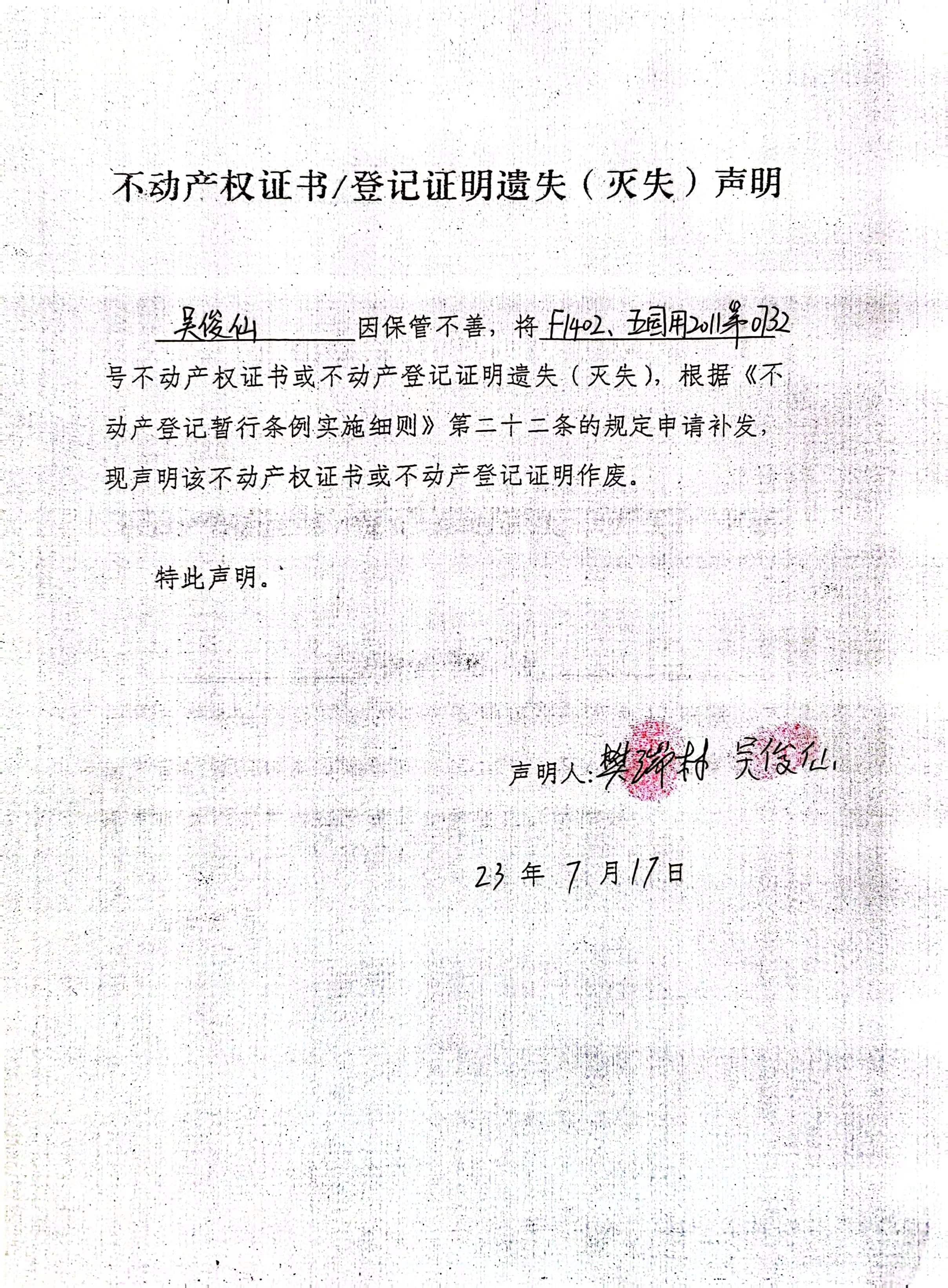 吴俊仙 遗失:F1402、五国用2011第0732号