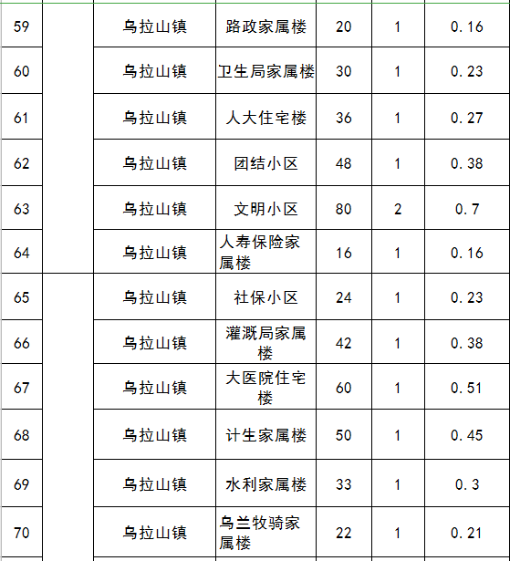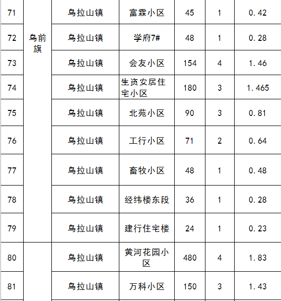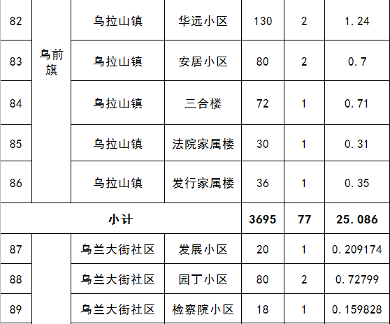 → 乌拉特前旗有建行家属楼等46个老旧小区、25.08万平米,涉及77栋楼、3695户居民;