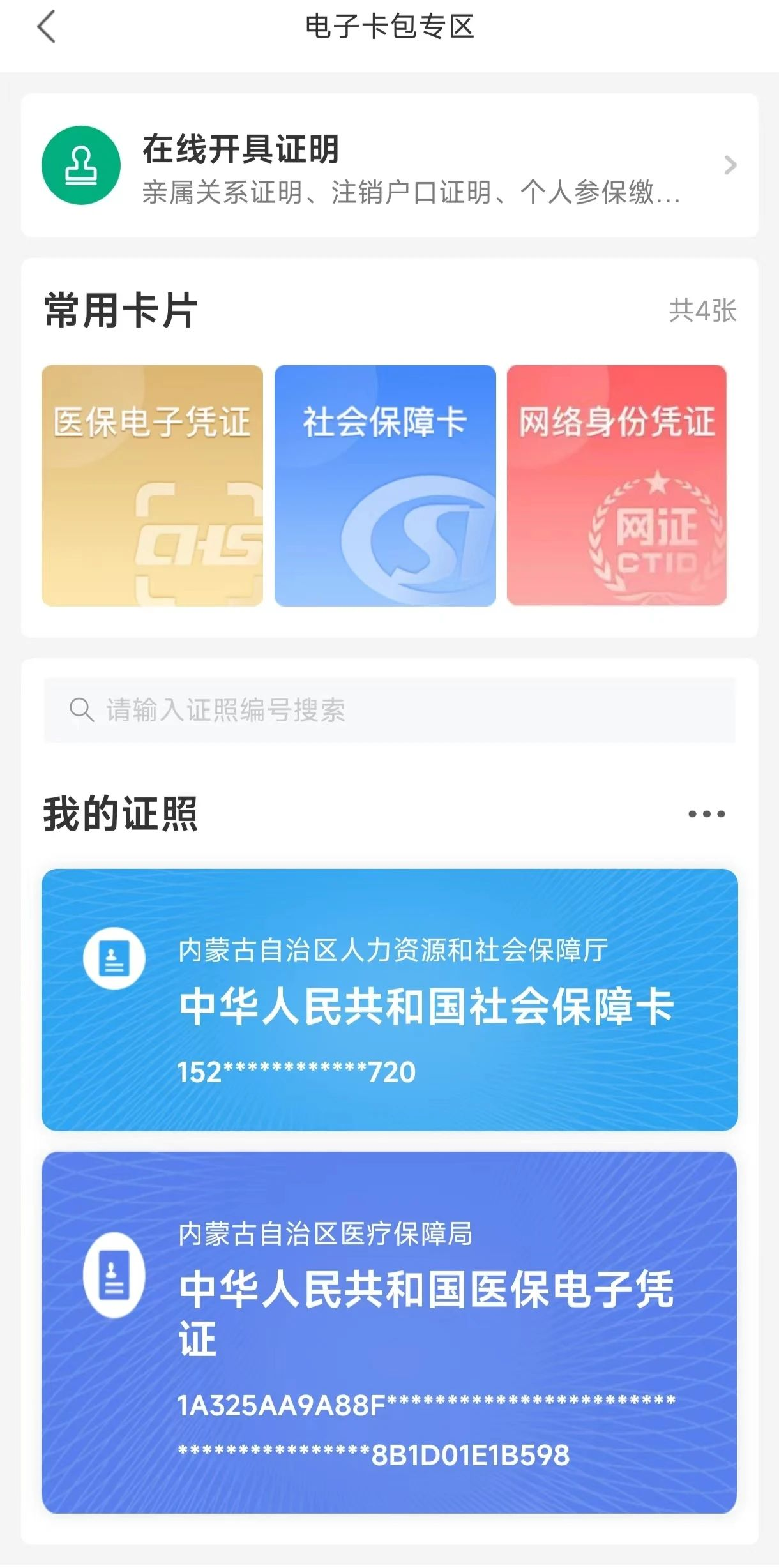 申请人可登录内蒙古政务服务网用户中心或“蒙速办”APP电子卡包专区查看自己的电子证照,在办理具有与事项关联的电子证照时实现“免证办”。