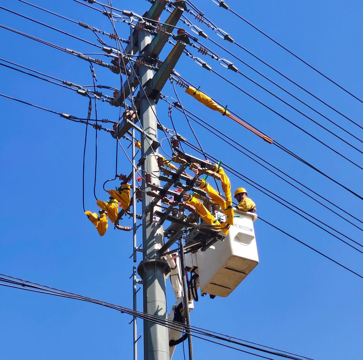 作业现场,身着厚重绝缘披肩的带电作业人员戴上安全帽、绝缘手套等装备,进入作业斗抵近十几米高空故障作业点后,在狭小的斗臂内有条不紊地展开作业,依次进行验电、绝缘遮蔽、解接分支引流线、拆除绝缘遮蔽......经过30分钟的奋战,回到地面后,作业人员脱掉厚重的防护披肩、摘掉安全帽、手套后,衣服、头发整个湿透,高强度的“日光浴”使他们满脸涨红,接过同事递来的矿泉水,咕咚咕咚一饮而尽。然而就是这样,他们稍作休息,或者匆匆吃口饭,又迅速赶往下一个作业现场。