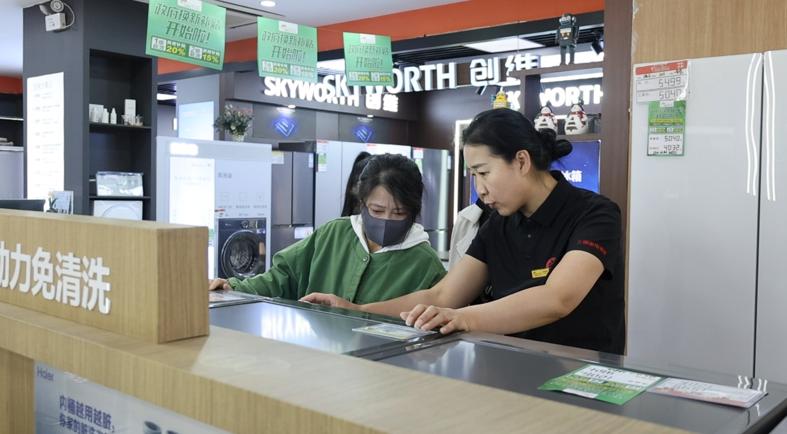 走进五原县家电销售门店,换新补贴标语随处可见,传递着惠民政策的“好声音”。店内琳琅满目的家电整齐陈列,冰箱、洗衣机、电视等热门区域围满咨询的市民。导购员耐心细致地讲解产品功能与补贴细则,收银台前工作人员高效快捷地办理补贴结算,整个场景洋溢着消费升级的火热氛围。