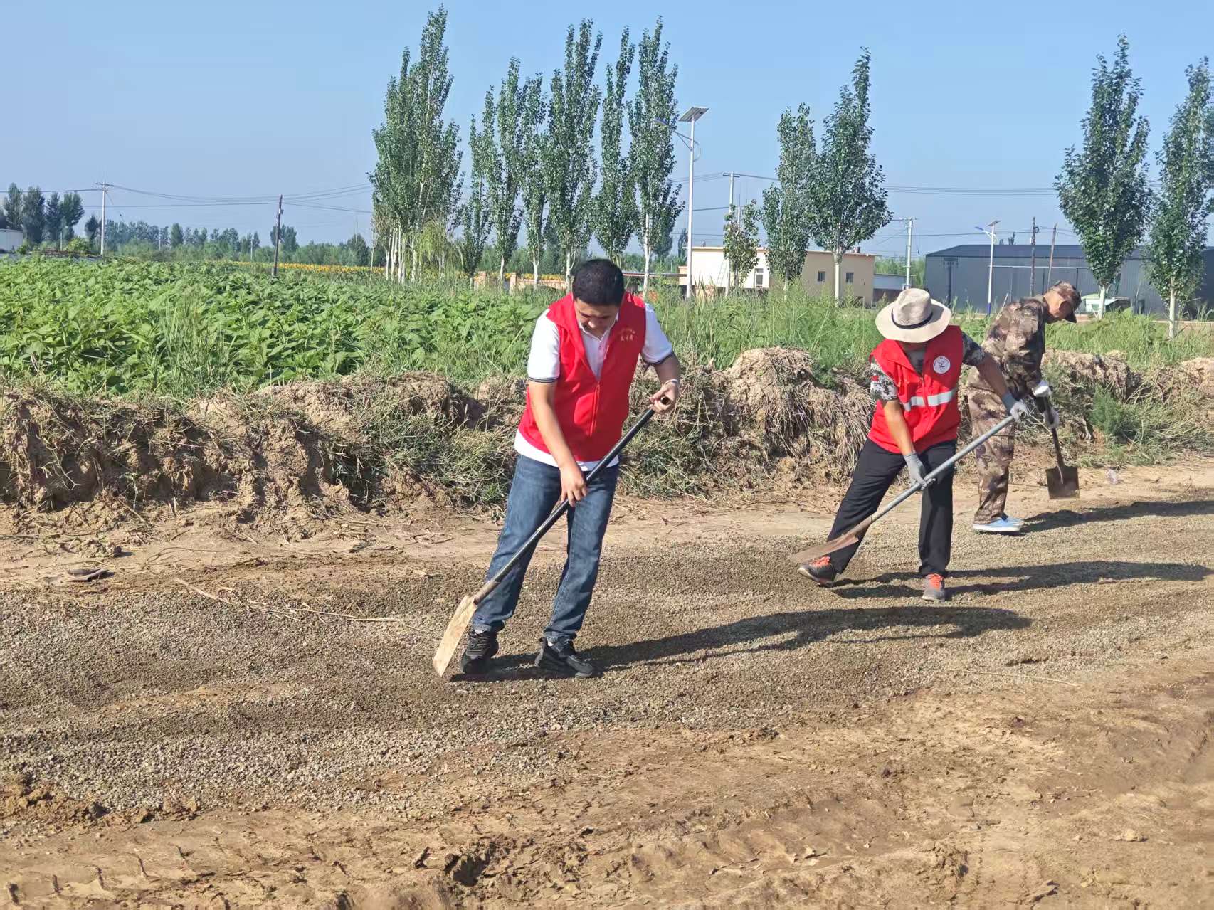 在和胜乡新永村三组的泥泞小路上,记者看到,大型机械正轰鸣着将砂石料均匀地摊铺在路面,志愿者们紧随其后,利用铁锹等工具进行细致平整。随着作业队伍的不断向前,平整的小路逐渐延伸,原本坑洼的路段变得坚实起来,来往车辆也通行顺畅。