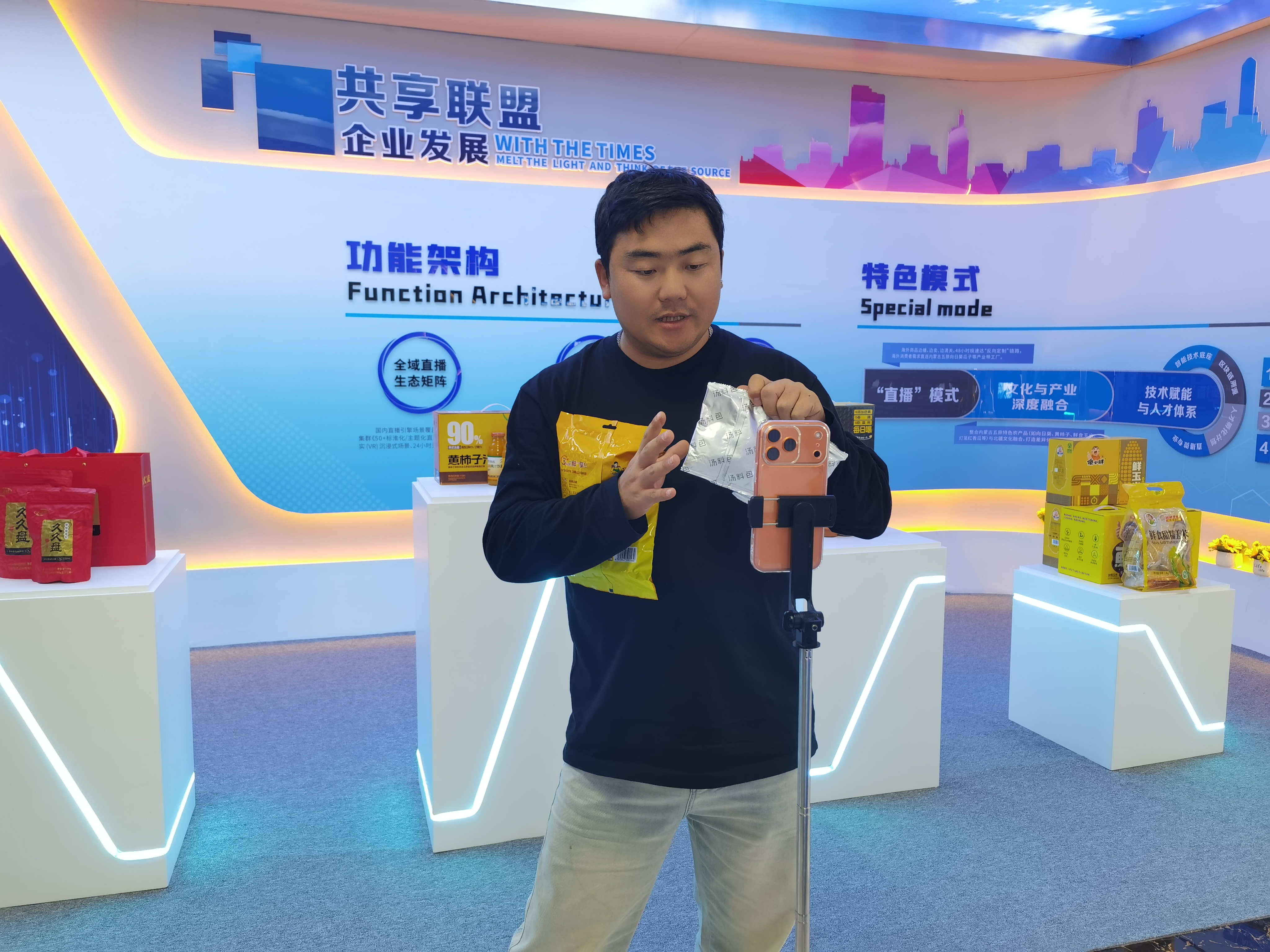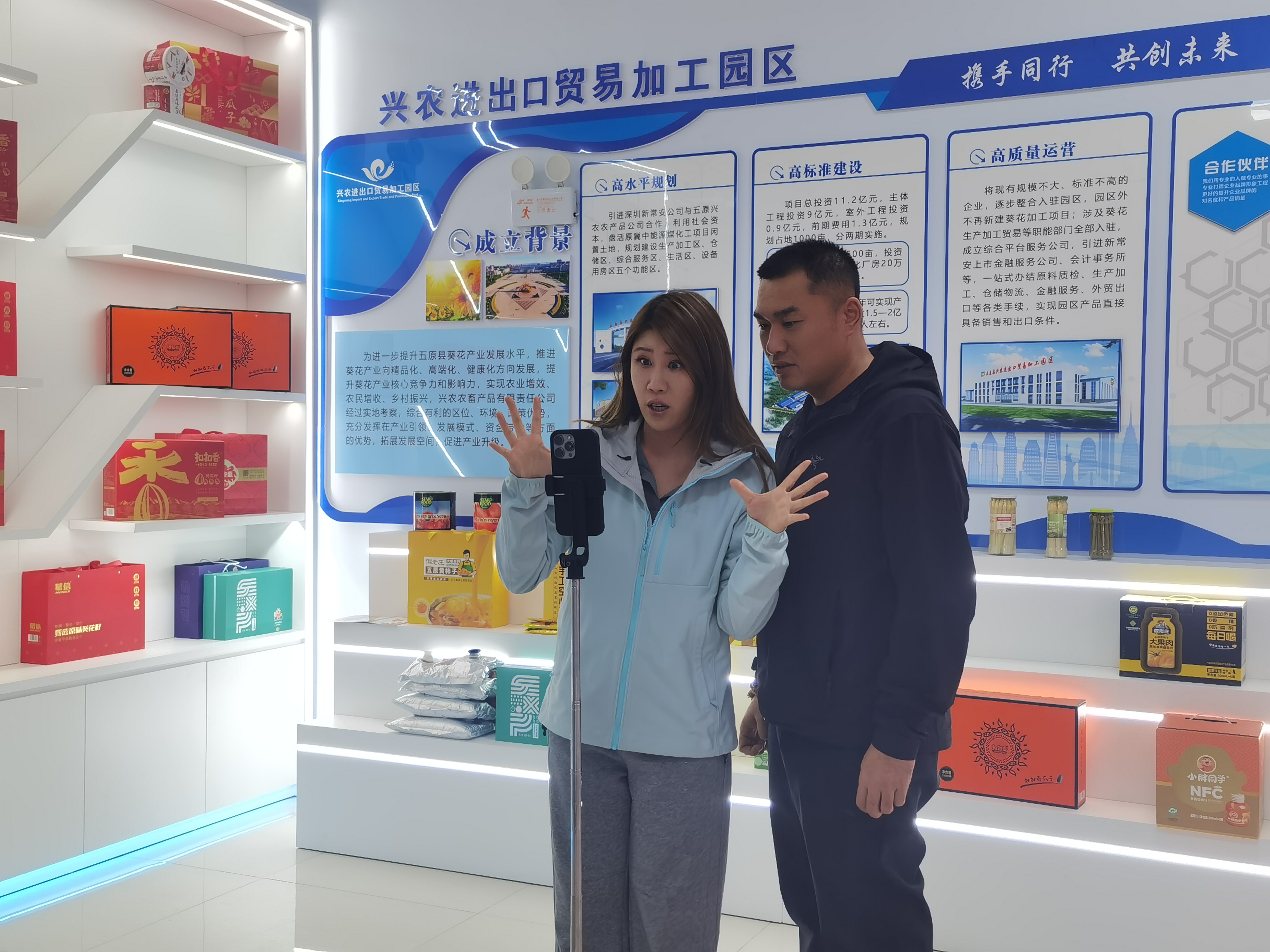 走进兴农进出口贸易加工园区办公大楼的产品展厅,五原县各类特色农畜产品琳琅满目,黄柿子汁、真空包装糯玉米、精品葵花籽等一系列精深加工产品整齐陈列。直播镜头前,主播正热情地向屏幕前的广大网友详细介绍五原县的招牌产品糯玉米,从种植环境到口感特点,再到营养价值,引得评论区互动不断,纷纷下单。