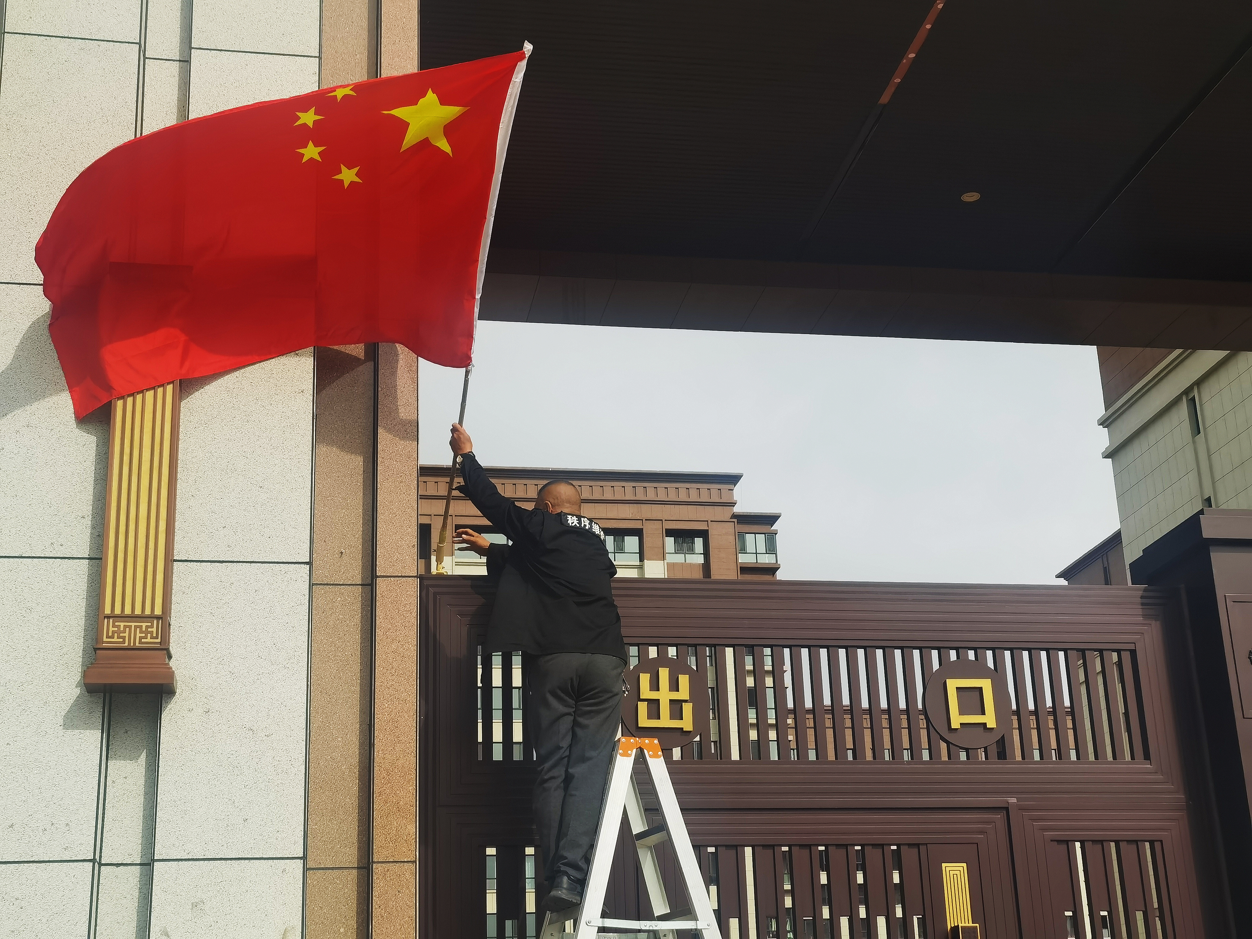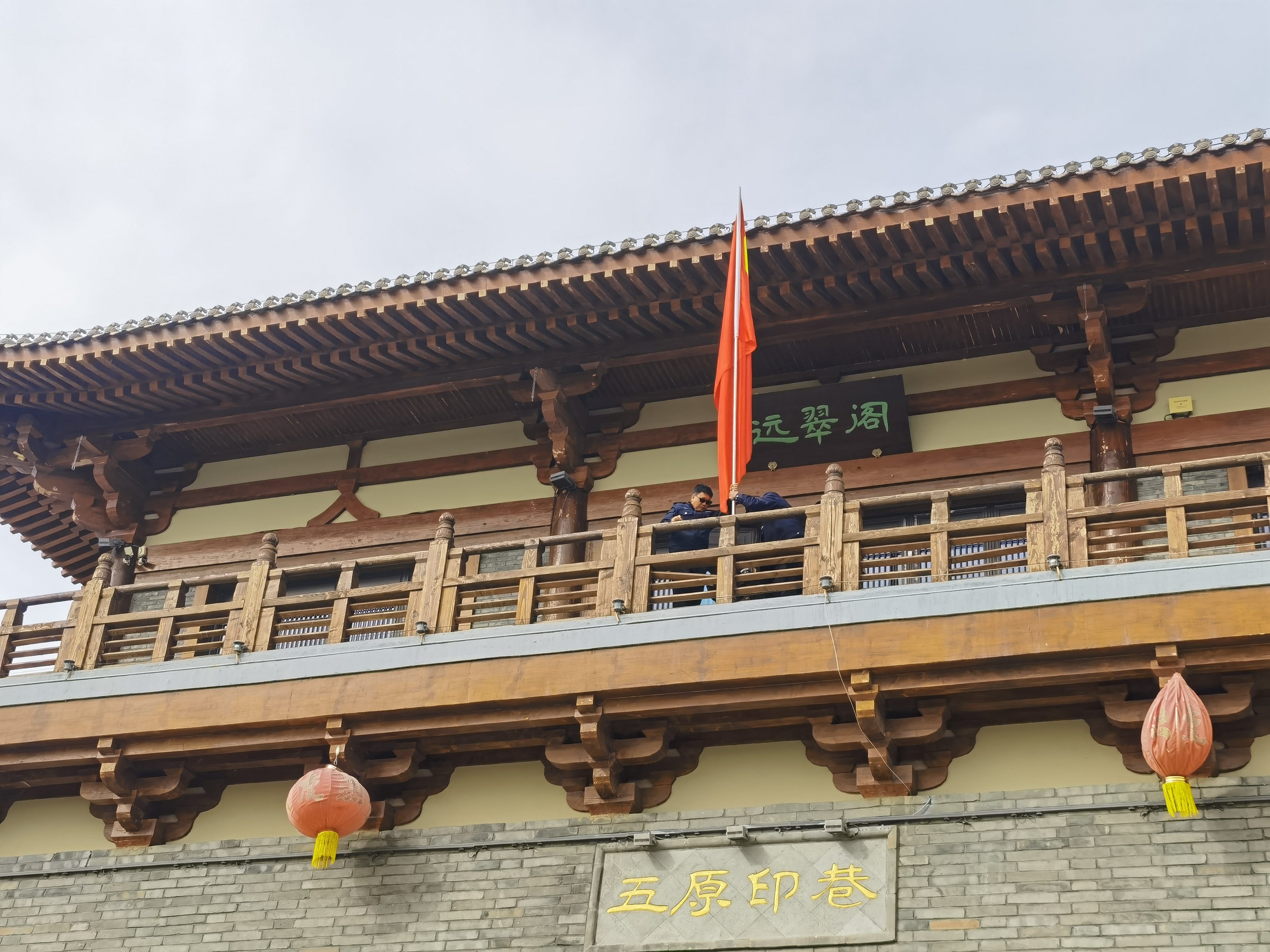 在充满古韵的五原印巷,工作人员更是将一面国旗悬挂在古色古香的城楼上。红墙黛瓦间,“中国红”格外醒目,既有传统文化的厚重感,又有节日的喜庆感,引得过往游客纷纷驻足观赏。